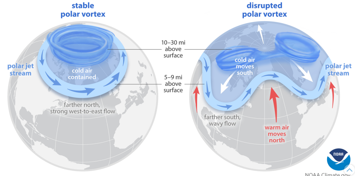 Leva stran kaže močan polarni vrtinec drži mraz na Arktiki, curek teče naravnost. Desna stran kaže oslabljen vrtinec: vrtinec se lahko poruši, mraz se razlije proti jugu, curek postane vijugast – lahko pridejo mrzli vdori in snežne nevihte v Evropo. Bele puščice navzdol pomenijo hladen zrak proti nam, rdeče navzgor pomenijo topel zrak proti Arktiki.