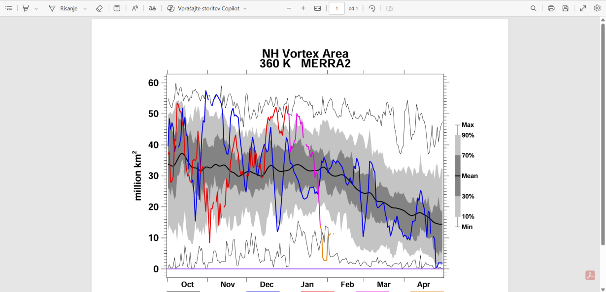 Spodnji graf pokaže, kolikšna je površina polarnega vrtinca na 360k(10-15km nad tlemi). To je eden najbolj zanesljivih indikatorjev moči polarnega vrtinca: večja površina pomeni močnejši, bolj stabilen vrtinec. Trenutno vidimo da je površina le okoli 10 milijonov km² in bo v začetku februarja padla na okoli 3. To je že ekstremna oslabitev, ki jo vidimo le pred močnimi SSW dogodki.