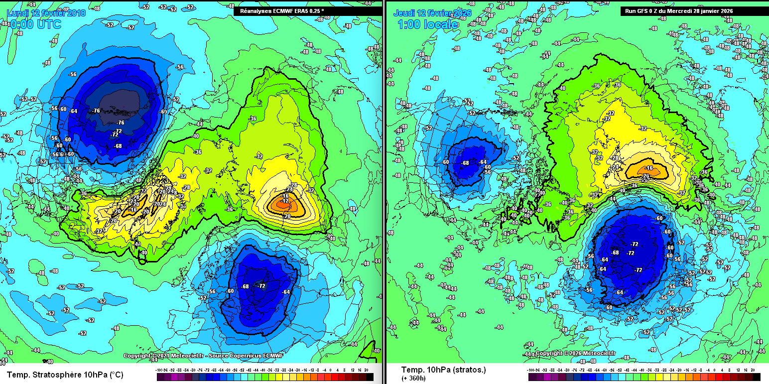 Na levi sliki se jasno vidi val 2(2 “grebena”, ki običajno razcepi polarni vrtinec, na desni stanje v spodnjem delu stratosfere na 50mb, ki je za nas precej bolj pomembno, glavni del vrtinca nad Evrazijo