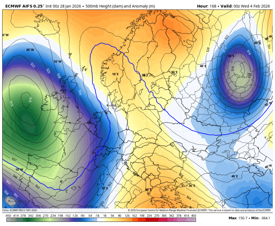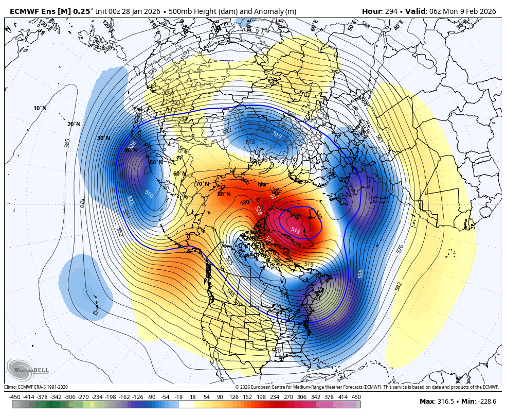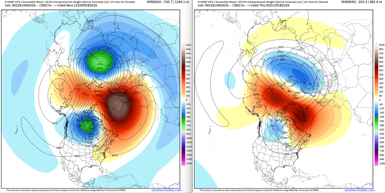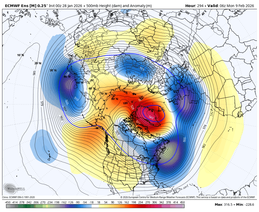 Na karti spodaj vidimo dve izraziti pozitivni anomaliji geopotencialne višine. Eno nad severnim delom Atlantika in drugo nad severnim Pacifikom. To je klasičen wave-2 signal. Med njima sta dve jedri negativnih anomalij: eno nad Azijo/Sibirijo in drugo nad severnim delom Kanade. Takšna struktura pomeni, da se polarni vrtinec razcepi ali vsaj močno raztegne na dva dela – en del nad Evrazijo, drugi nad Kanado.