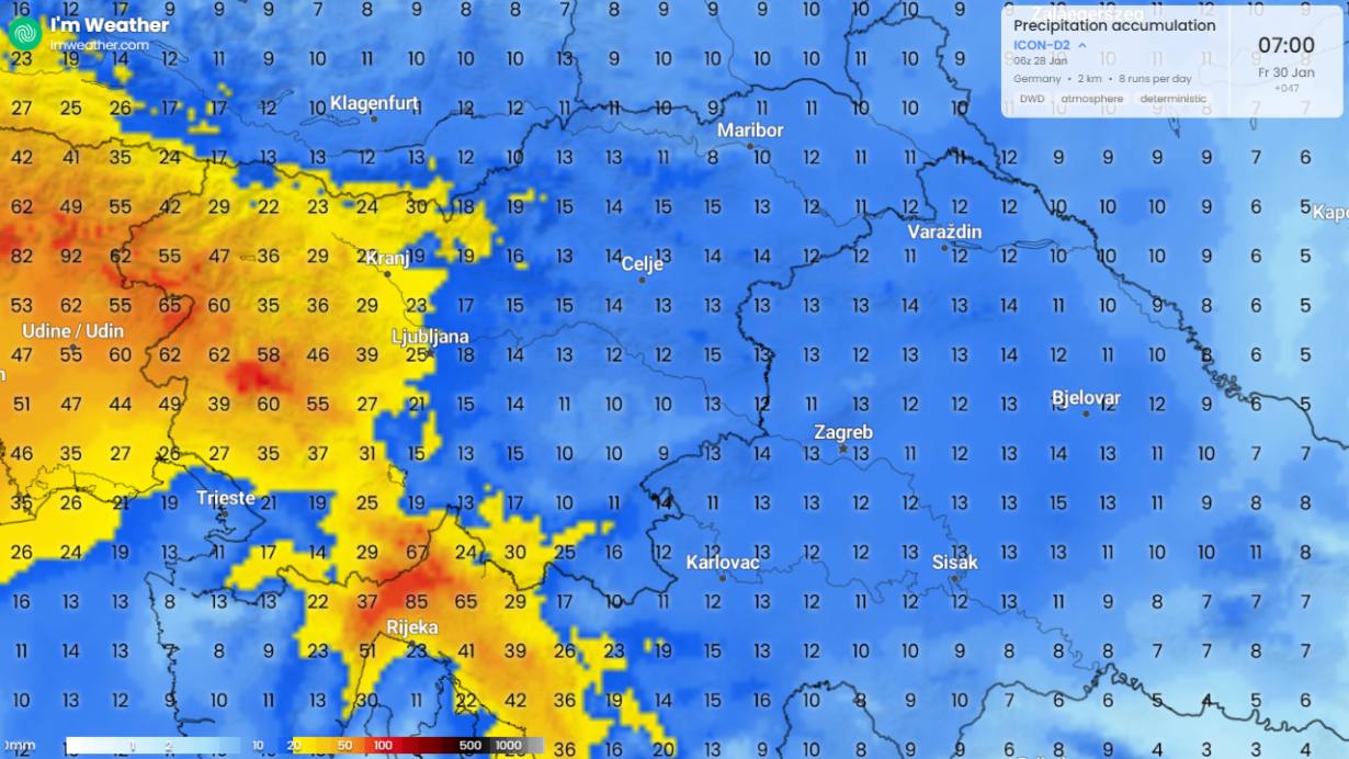 S postopnim premikom jedra ciklona nad Balkan bo vertikalna komponenta vetra oslabela, zato lahko pričakujemo postopno zmanjšanje hitrosti vetra v višjih slojih in umirjanje vremenskih pojavov v drugi polovici noči na četrtek. Meja sneženja bo razmeroma visoko, večinoma nad 1100m, le v alpskih dolinah nekoliko nižje.