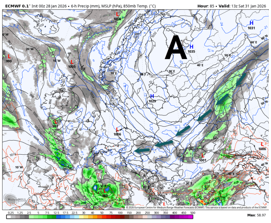 Okoli 9. februarja se modelske sinoptične konfiguracije vse pogosteje nagibajo k postopnemu prehodu na meridionalni tip cirkulacije, kar bi lahko omogočilo vpliv stratosferskih motenj na troposfersko situacijo. Opazna je tvorba močne blokadne anomalije nad Grenlandijo. Vendar pa so takšne sinoptične spremembe, vključno s prenosom signala iz stratosfere v troposfero in trajnostjo grenlandske blokade, v tej fazi še obremenjene z veliko stopnjo negotovosti: različni skupinski izračuno modelov kažejo različno verjetnost nastanka in trajanja blokade ter časovne zamejitve njenega vpliva.