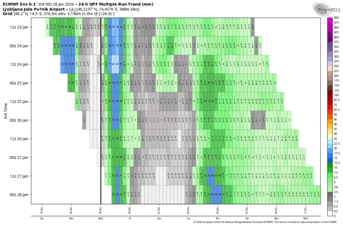 Po evropskem skupinskem izračunu se možnost za padavine s torkom poveča in bo lahko trajalo dlje časa