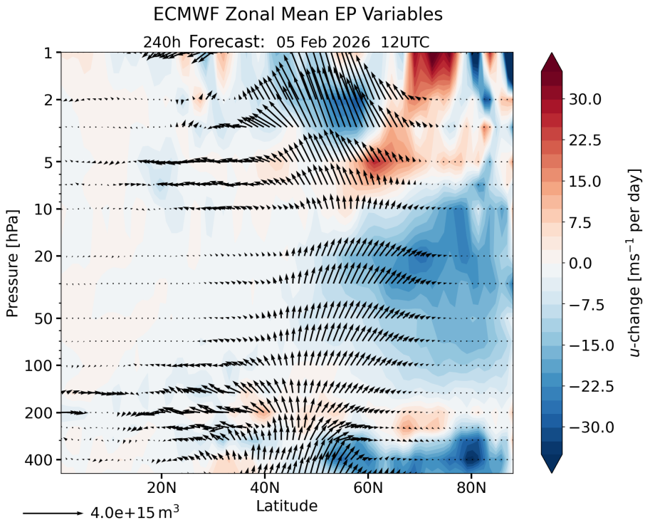 EP flux kaže prevladujočo modro barvo v večini troposfere in spodnje stratosfere, zlasti med 40°N in 80°N. Modra pomeni negativen EP flux – to je konvergenca valovne aktivnosti (valovi se “zadržujejo” ali absorbirajo), kar povzroča upward wave forcing v stratosferi.