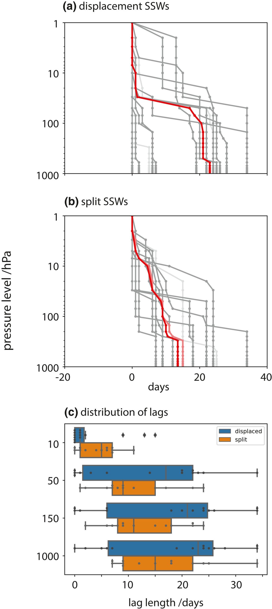 Rezultati so presenetljivi. Od 39 SSW je 27 pokazalo jasen navzdolni prenos (dSSW), ostali pa ne (nSSW). Mediana zamika od stratosfere do površja je 15 dni za razcepitve (13 dogodkov) in 23 dni za premike (14 dogodkov) – razlika približno en teden, čeprav statistično ni zelo pomembna (p=0.42). Razcepitve imajo bolj kompaktne zamike (večinoma pod 20 dnevi), premiki pa dve skupini: kratki (pod 10 dnevi) in dolgi (nad 15 dnevi). Ko so analizirali vplive okoli datuma površinskega vpliva (d0), namesto okoli začetka, so dobili ostrejše signale.
