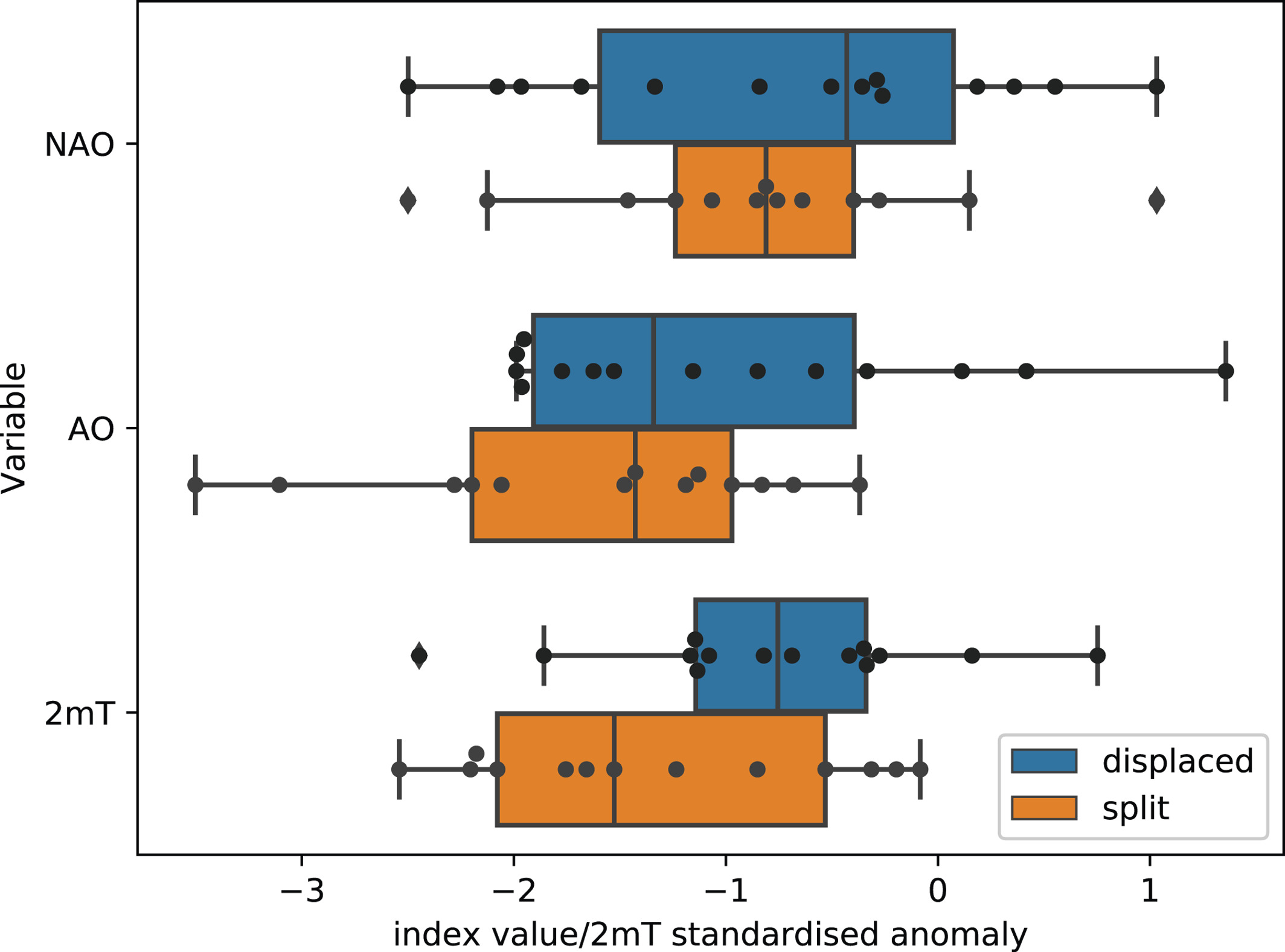 Na NAO in arktični oscilaciji (AO) ni velikih razlik – oba tipa prinesejo negativne vrednosti (–0.51 za razcepitve, –0.40 za premike), a razlike niso statistično pomembne. Vendar so temperaturne anomalije nad severozahodno Evropo bistveno hladnejše za razcepitve (p<0.05), zlasti teden pred in po d0. Nad Združenim kraljestvom in Skandinavijo so anomalije do –5 do –10 stopinj Celzija pod povprečjem. Nad severno Evrazijo je hladen signal obsežnejši za razcepitve. Padavine kažejo nasprotno: premiki prinesejo več padavin nad severozahodno Evropo po d0 (p<0.05), razcepitve pa sušnejše razmere tam, a več vlage na jugu (Sredozemlje). Curek se za razcepitve premakne 3 stopinje južneje, kar pojasnjuje hladnejši vdor.