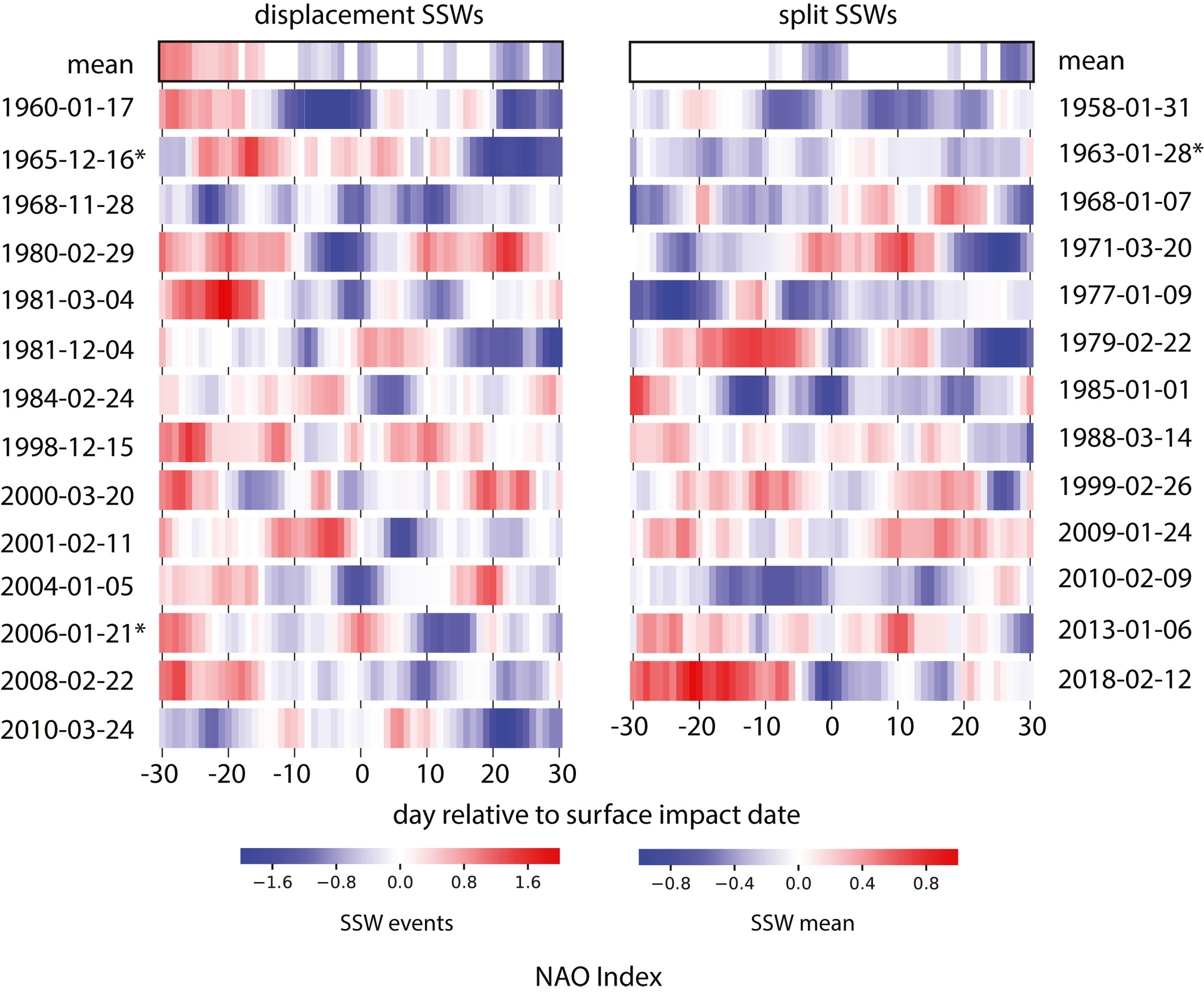 Ta fotografija pokaže, kako se NAO (merilo za vreme v Evropi) spreminja po SSW. Modra = negativna NAO = mraz in nestabilnost pri nas. Desna stran (razcepitve) je bolj modra in enotna – razcepitve pogosteje prinesejo močan mraz v Evropo. Leva stran (premiki) ima več mešanice, manj ekstremov. Zato razcepitve pogosto pomenijo daljše hladne in snežne zime!