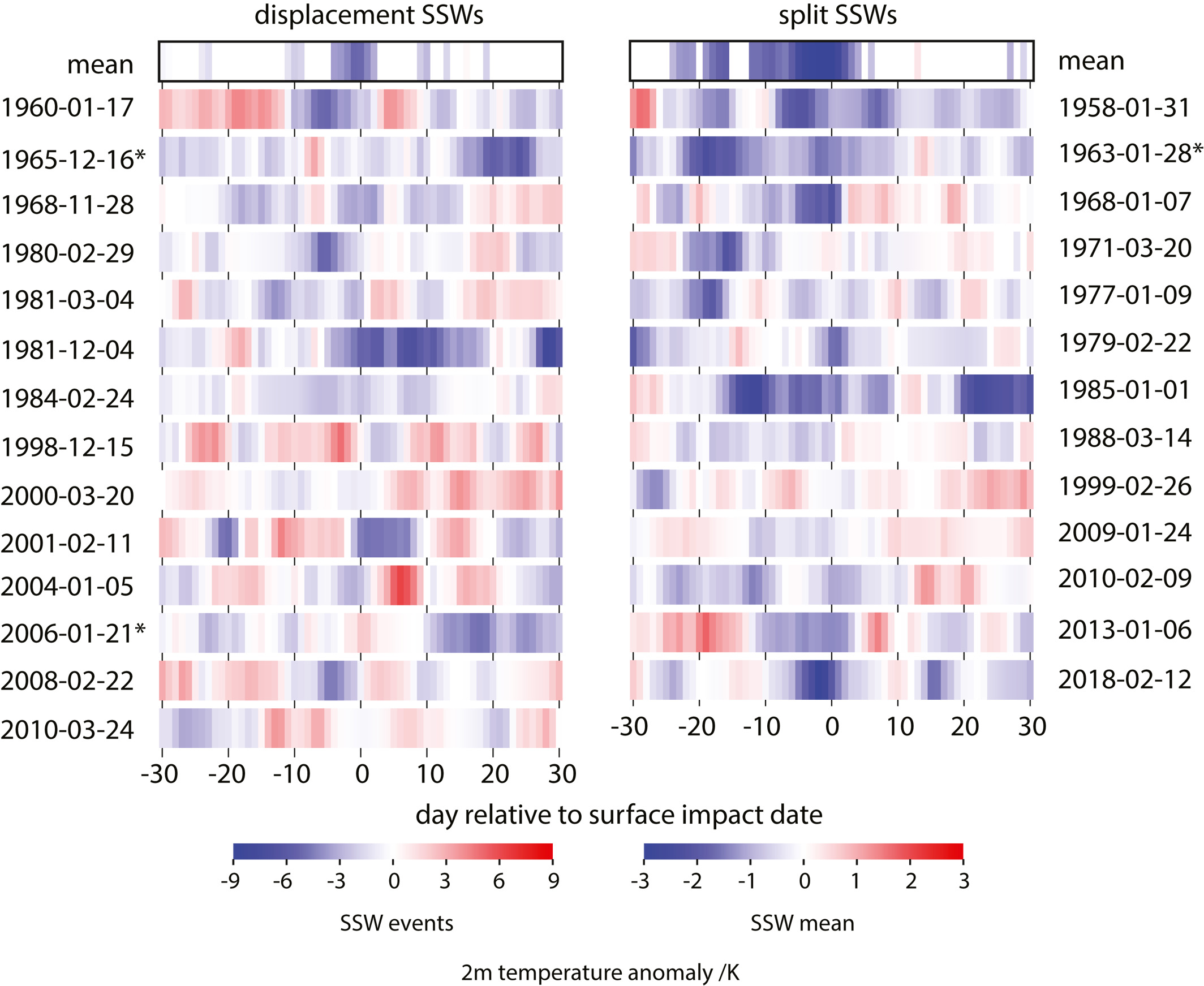 Ta slika primerja, kaj se zgodi na tleh po nenadnem stratosferskem segrevanju (SSW). Modra barva = premik vrtinca, oranžna = razcepitev. Zgornja dva grafa (NAO in AO) kažeta, da oba tipa prineseta podoben učinek: negativne vrednosti pomenijo slabše vreme, curek proti jugu in vdor mraza v Evropo. Najpomembnejši je spodnji graf (temperatura 2 m nad tlemi): oranžni okvirčki (razcepitve) so veliko nižje – torej prinesejo močnejši mraz! Razcepitve prinesejo hladnejše anomalije.