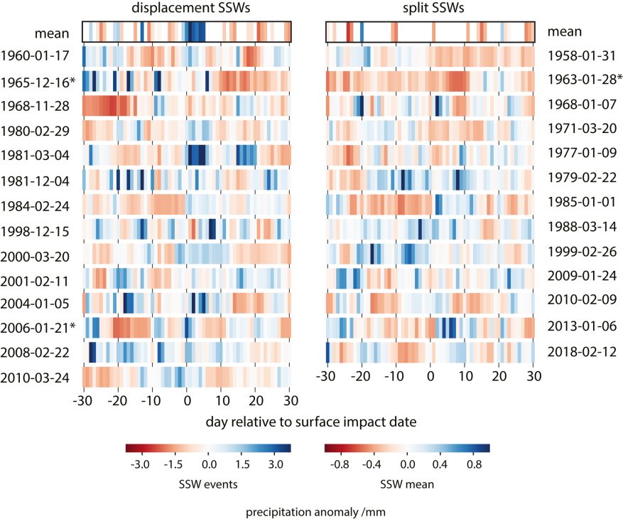 Ta fotografija kaže, koliko (ali malo) dežja/snega pade po SSW. Rdeča = manj padavin, modra = več padavin. Leva stran(premiki vrtinca) prinesejo vlažnejše vreme in več padavin. Desna stran (razcepitve) je bolj modra → split dogodki pomenijo sušnejše razmere in manj padavin. Zato po razcepitvah pogosto dobimo suh, leden mraz, po premikih pa bolj mokro in oblačno.