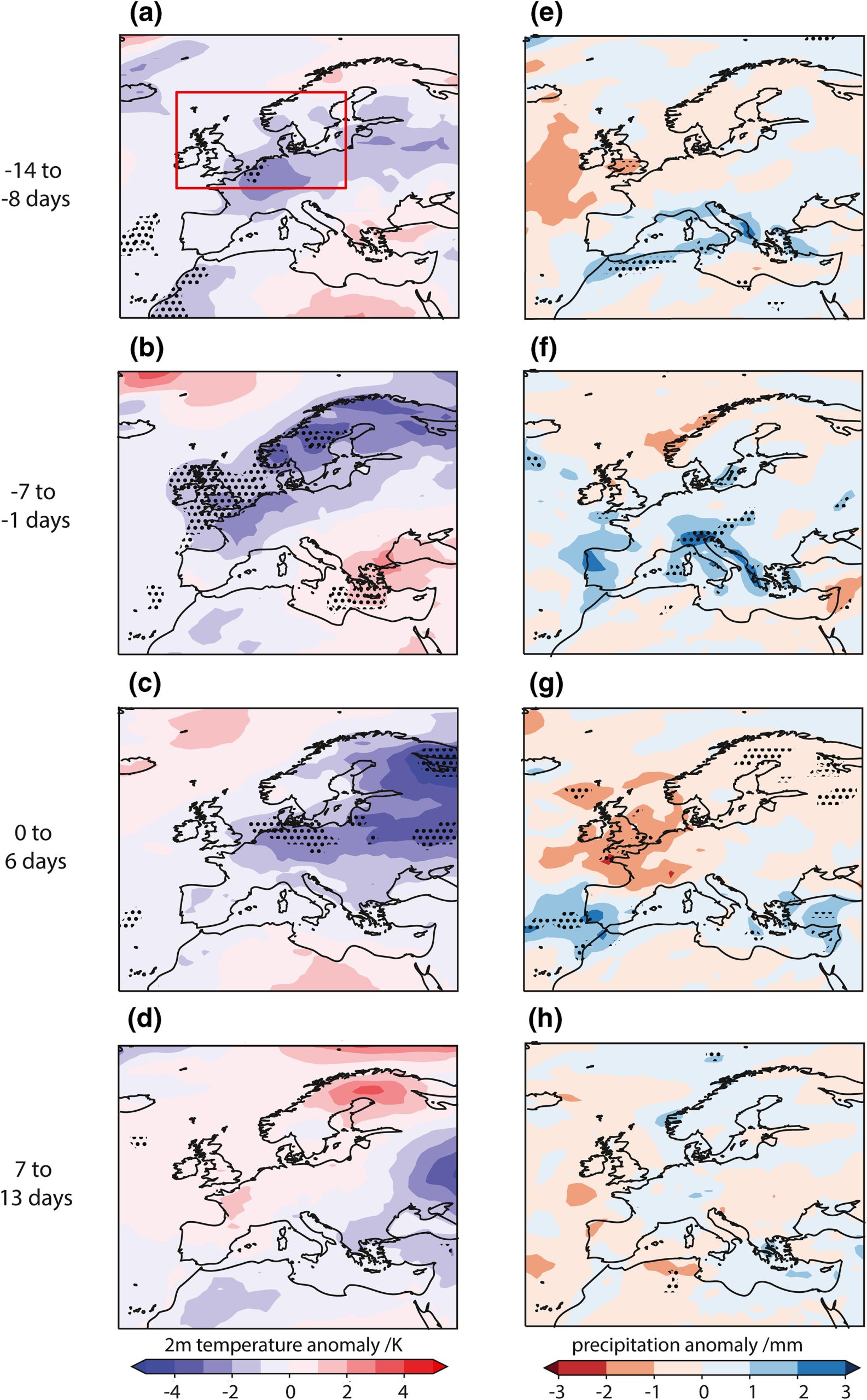 Evropske razlike med temperaturnimi anomalijami na površini (a–d) in padavinskimi anomalijami (e–h) za dogodke razcepa minus premika. Leva polovica je temperatura (modra pomeni mraz), desna pomeni padavine (modra pomeni več dežja/snega). Razcepitve (split) prinesejo močnejši mraz (temnejša modra nad severozahodno Evropo) in manj padavin (več rdečega). Premiki pa blažji mraz in več padavin (več modrega). Zato razcepitve pogosto pomenijo suh, leden mraz in sneg pri nas v Sloveniji, premiki pa bolj vlažno in oblačno.