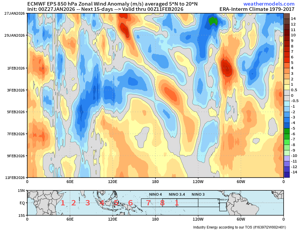 Poglejmo si novo stanje v atmosferi. Od zadnjega zapisa se ni veliko spremenilo. Trenutno stanje Madden-Julian Oscillation (MJO) je za naš scenarij z oslabljenim polarnim vrtincem nevtralno do rahlo negativno. MJO je v fazi 7 z amplitudo okoli 1 (zahodni Pacifik, aktivna konvekcija nad Indonezijo in zahodnim Pacifikom). Kmalu bo prešel v fazo 8 (centralni Pacifik) in postopno še bolj oslabel, lahko bo šel znotraj kroga, kar pomeni, da signal postane prešibek za jasen vpliv na širjenje planetarnih valov.