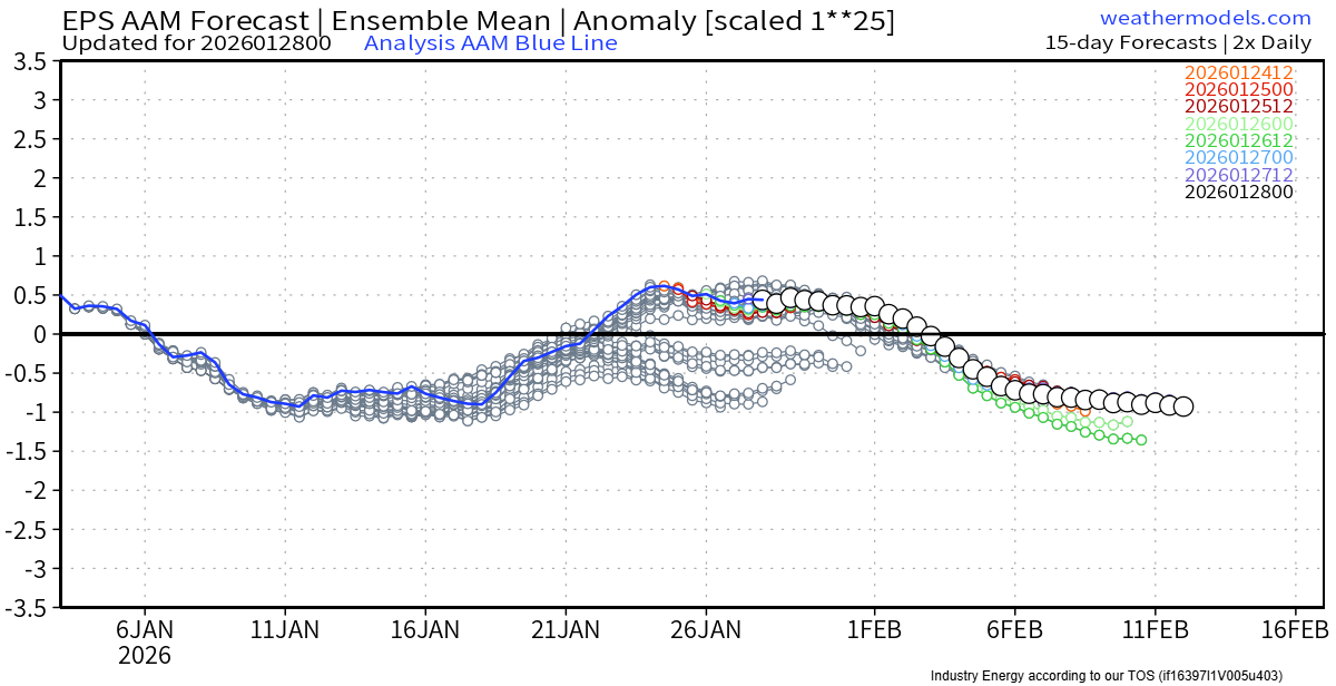 Dodaten pomemben indikator je AAM indeks (atmosferski kotni moment). Trenutna EPS prognoza kaže, da bo AAM v prvih dneh februarja prešel v negativno območje, okoli 4. februarja pa se bo še dodatno poglobil v negativo. Negativen AAM je pogosto povezan z oslabitvijo polarnega vrtinca in povečano verjetnostjo SSW, saj zmanjša zonalne vetrove v srednjih širinah in olajša širjenje planetarnih valov navzgor v stratosfero.