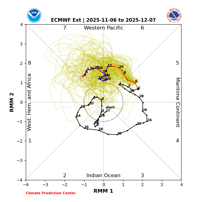 MJO se je zataknil v fazi 5 in je imel v prvih dneh novembra retrogradno premikanje nazaj proti zahodu. Kot vidimo pa to ni zadnjo “zatikanje”