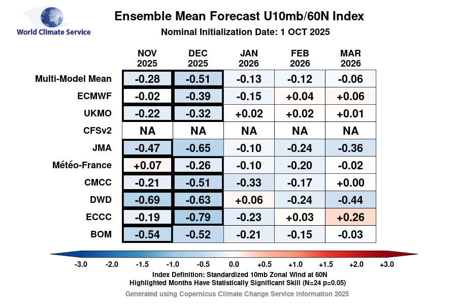 Tabela prikazuje napovedi indeksa U10mb/60N, ki meri standardizirano zonalno hitrost vetra na višini 10 mb pri 60° severne širine. Vrednosti predstavljajo odstopanja od povprečja, kjer negativne vrednosti nakazujejo na šibkejši polarni vrtinec(vir Copernicus Climate Change Service)