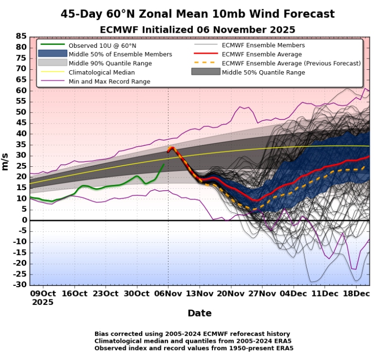 Poglejmo podrobneje, kakšno je stanje v stratosferi. V letošnji zimi bo, kot kaže, polarni vrtinec v prvi tretjini šibkejši kot običajno. To ne preseneča, vsaj za tiste, ki ste bili pozorni na moj zadnji članek, kjer sem se posvetil polarnemu vrtincu ter različnim dejavnikom, ki nanj vplivajo. Sezonske napovedi, ki smo jih zasledili že oktobra, so očitno bile točne, saj so že takrat nakazovale na možnost šibkejšega vrtinca, še posebej na začetku zime. V prihodnjih tednih lahko torej pričakujemo, da se te napovedi dejansko uresničijo.