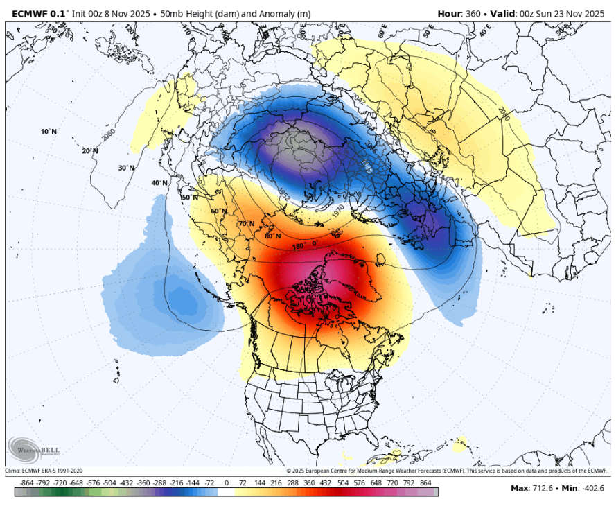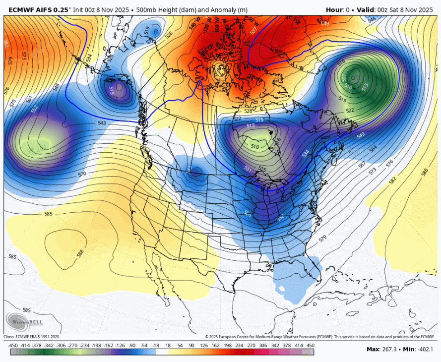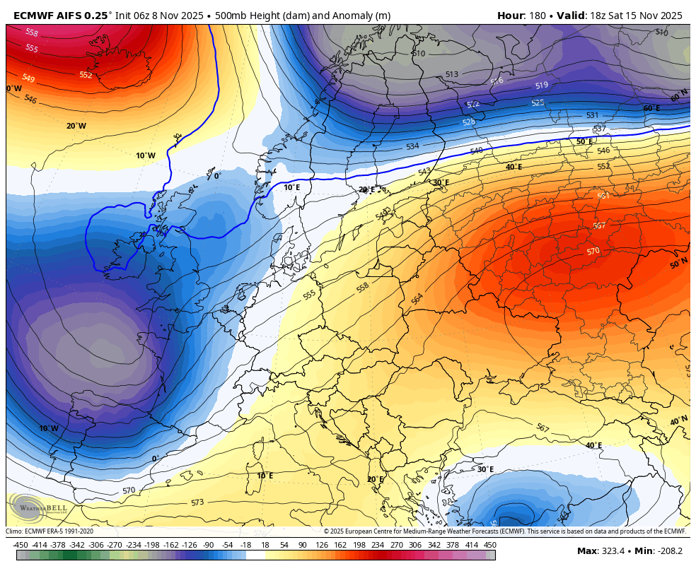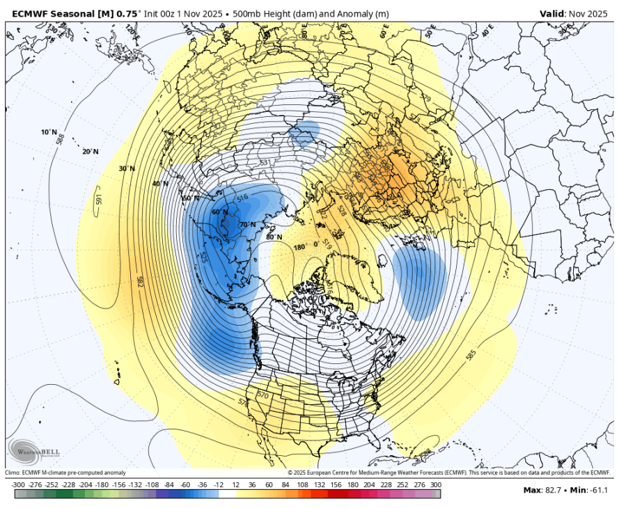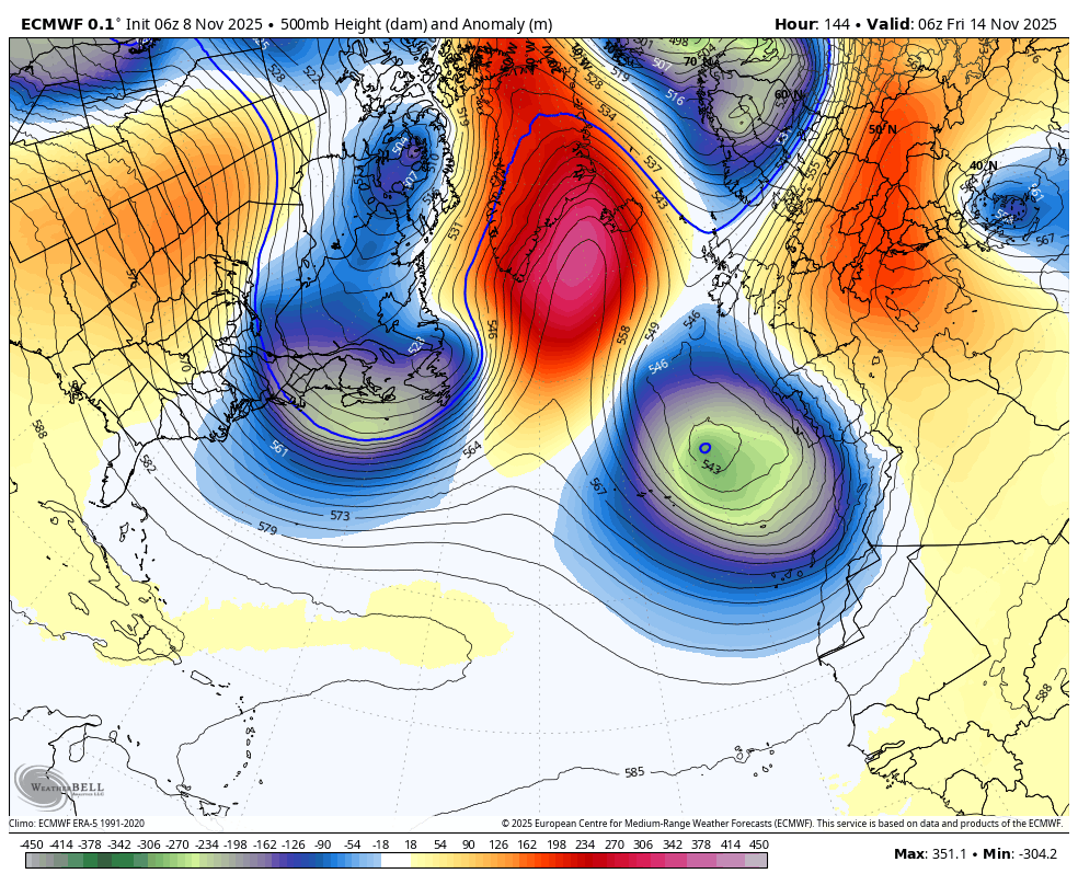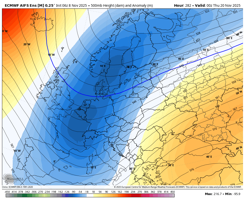 Karta prikazuje višino 500mb (v dekametrih) in anomalijo (v metrih) za november 2025(vir weatherbell)