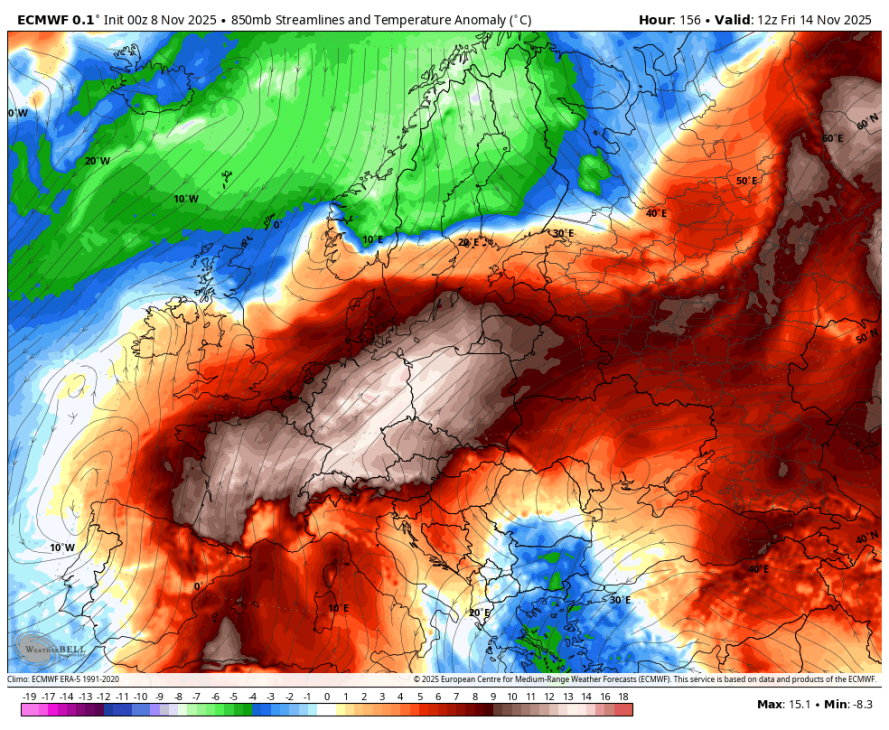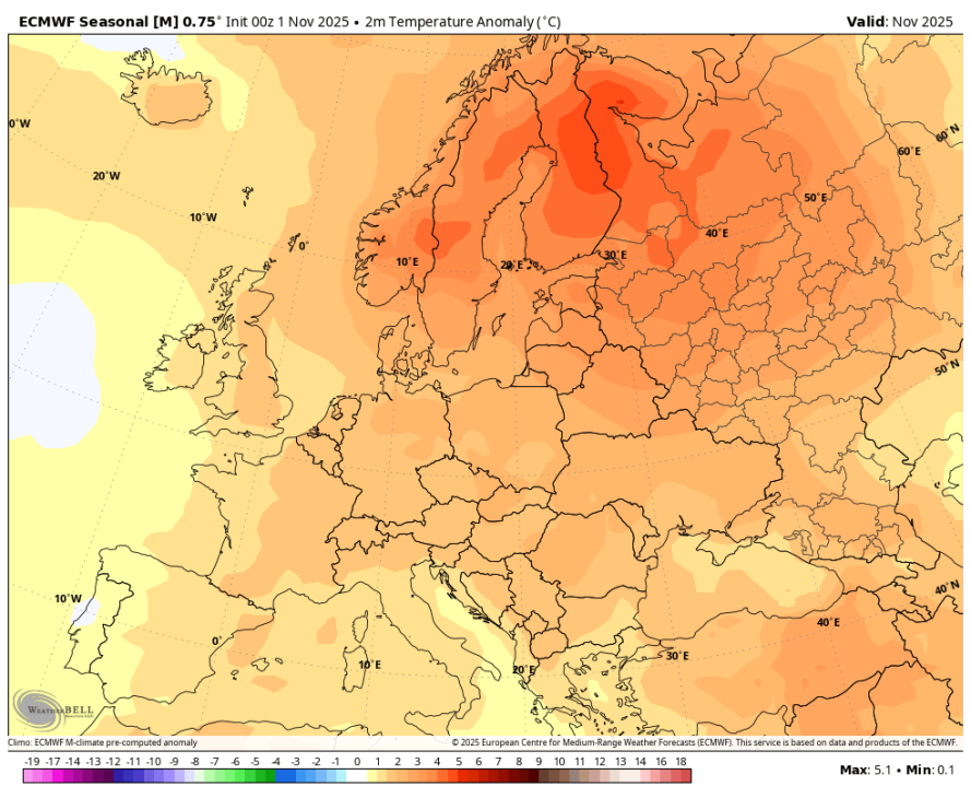 Če pogledamo temperaturno odstopanje, je nad Skandinavijo kar +5 °C, nad nami pa nekje med +1 °C in +2 °C. Nad Skandinavijo je trenutno res največje, toda v drugi polovici meseca bo tam precej nižje in na koncu skoraj zagotovo ne bo tako veliko.