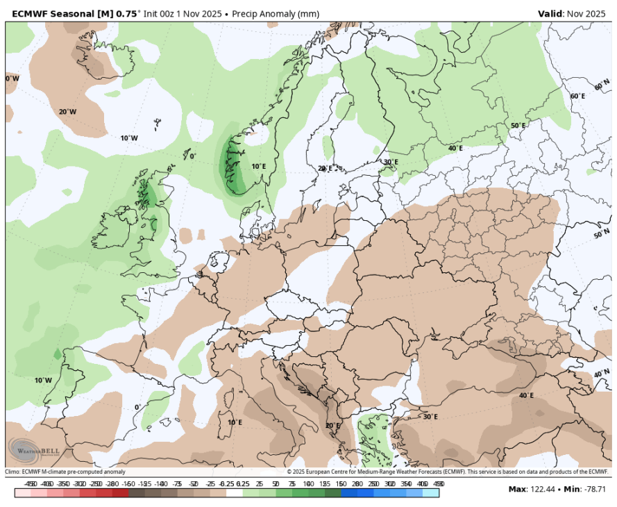 Za oktober se je sezonska napoved kar uresničila, predvsem mi je všeč, da je videl pozitivne padavinske anomalije nad jugozahodno Slovenijo. V Portorožu je padlo skoraj dvakrat več padavin kot običajno. November prinaša pozitivne anomalije oz greben nad vzhodno polovico Evrope, ciklon pa nad severnim delom Atlantika, to je tipična NAO+ slika. Sicer precej dvomim, da bo tako na koncu. Negativne anomalije ali vsaj enakomerne bi postavil nad Skandinavijo, ker glede na stanje v stratosferi je to najbolj verjeten scenarij.