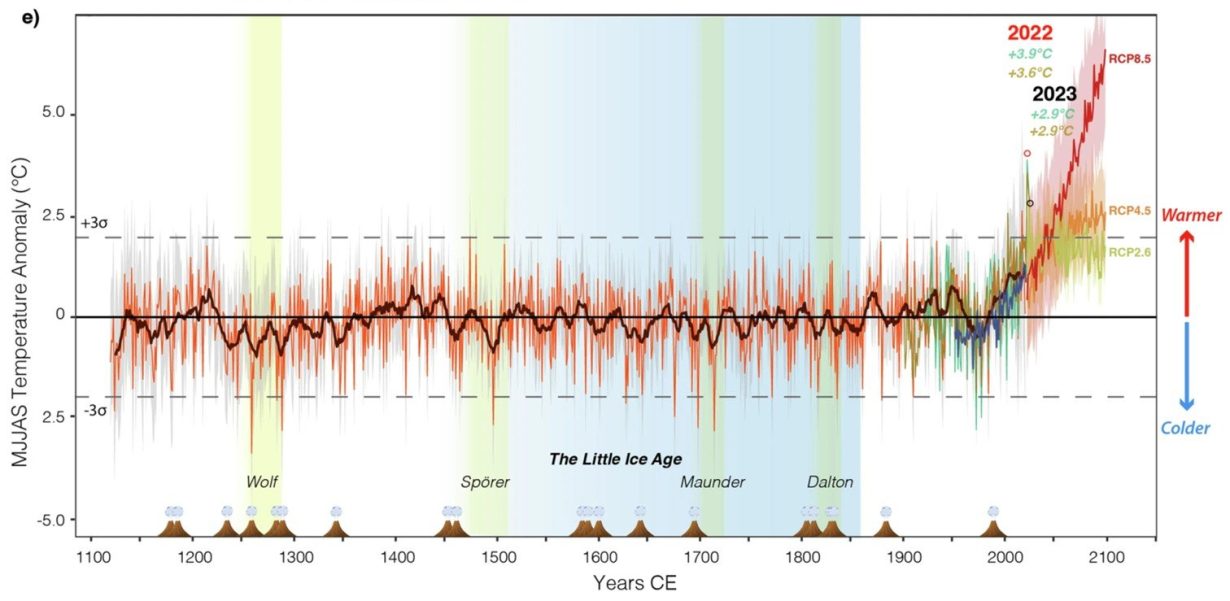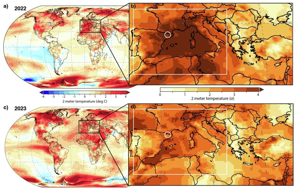 Poletni obdobji 2022 in 2023 sta bili primer negativnih vplivov podnebnih sprememb v sredozemski regiji. V teh letih je zlasti zahodno Sredozemlje doživelo vročinske valove zgodovinskih razsežnosti. Študija objavljena leta 2024 v reviji Nature Climate and Atmospheric Science, poroča, da so bili ti dogodki brez primere, saj so temperature dosegle rekordne višine, tako v instrumentalnem obdobju kot v tisočletnem kontekstu (glej sliko). Slika prikazuje razvoj temperaturnih anomalij v obdobju od maja do septembra v zahodnem Sredozemlju od leta 1119 n. št. na podlagi temperaturne rekonstrukcije iz analize drevesnih obročev in instrumentalnih meritev od leta 1890. Slika prikazuje, da sta leti 2022 in 2023 med najtoplejšimi, s temperaturnimi anomalijami +3,6 °C oziroma +2,9 °C.