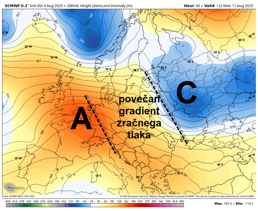 Povečan gradient zračnega tlaka med obema sistemoma bo prinesel osvežitev(vir weatherbell)