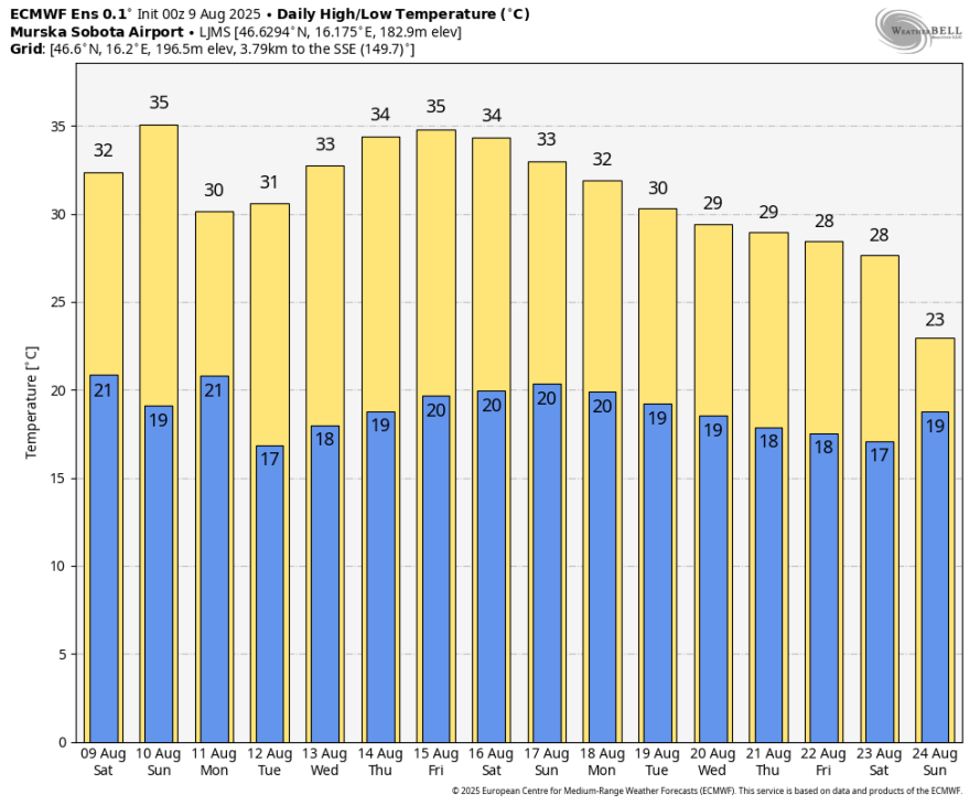 Z grebenom bodo seveda tudi prizemne temperature iz dneva v dan spet višje in bodo od torka povečini spet presegle tudi v notranjosti +30 °C. Tak tip vremena se bo verjetno nadaljeval čez večino naslednjega tedna. Temperaturni višek pa je videti v petek.