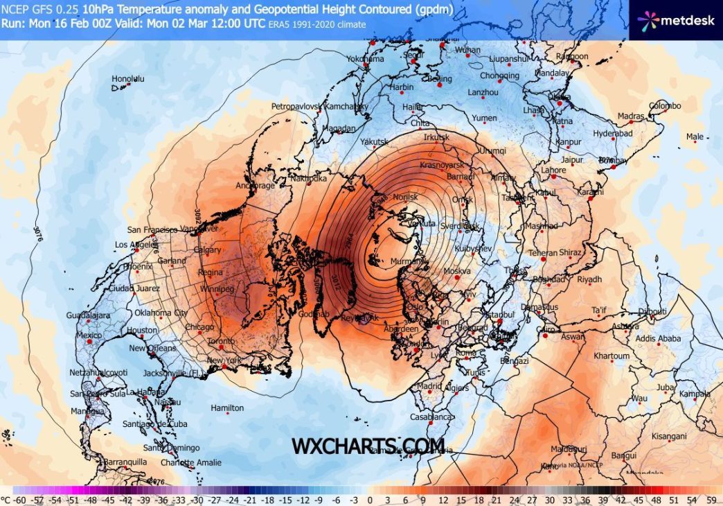 Stratosferska polja na ravni 10 hPa so v preteklem obdobju kazala izrazito moteno strukturo polarnega vrtinca, s toplimi anomalijami v polarnih širinah in znaki izgube simetrične oblike. Takšna konfiguracija je nakazovala možnost večje stratosferske motnje, ki lahko ob določenih pogojih vpliva tudi na cirkulacijo v srednjih zemljepisnih širinah. Novejši izračuni pa kažejo nekoliko drugačno sliko, saj se vrtinec v delu scenarijev ponovno organizira v bolj kompaktno strukturo, brez izrazite delitve na dva ločena dela. To pomeni, da signal motnje ostaja prisoten, vendar napovedi ne kažejo več tako enotnega razvoja razcepa, kot so ga nakazovali nekateri prejšnji modeli.