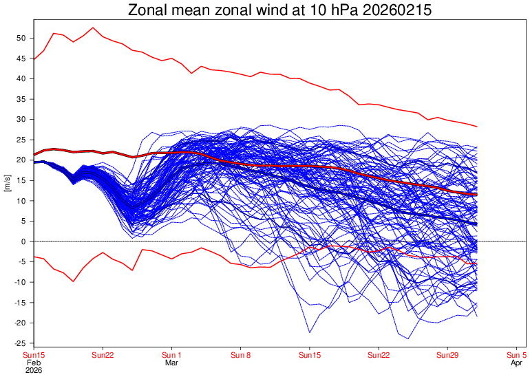 Ansambelska napoved zonalnega vetra na 10 hPa kaže splošen trend slabljenja zahodnega toka, vendar z izrazito razpršenostjo scenarijev. Del izračunov nakazuje nadaljnje oslabitve, drugi del pa stabilizacijo, kar odraža povečano negotovost v razvoju polarnega vrtinca.