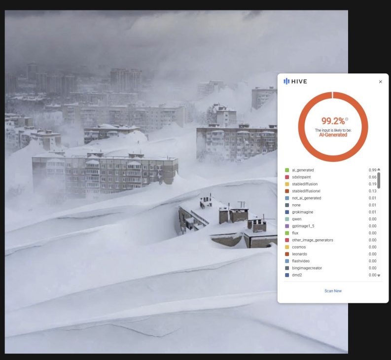 Kljub temu je trenutna situacija povzročila velik odziv na družbenih omrežjih. Bili so preplavljeni s fotografijami in videoposnetki visokih stavb, popolnoma prekritih s snegom. Obstajali so celo lažni posnetki otrok, ki so se sankali s streh visokih stavb (glej lažni video). A to je produkt umetne inteligence, ne pravih slik. Čeprav je sneg prekrival hiše v okolici do prvega ali drugega nadstropja, avtomobili pa so popolnoma izginili v snežnih zametih, sneg zagotovo ni segel do višine zgornjih nadstropij montažnih hiš. Konec koncev dejstvo, da slike ustvarja umetna inteligenca, potrjujejo tudi analitična orodja.