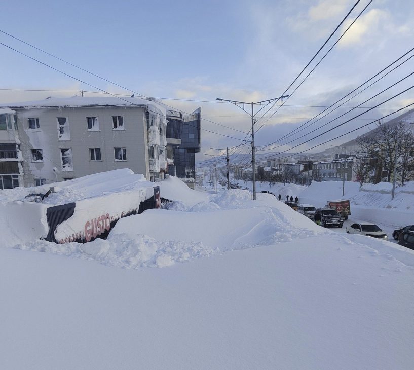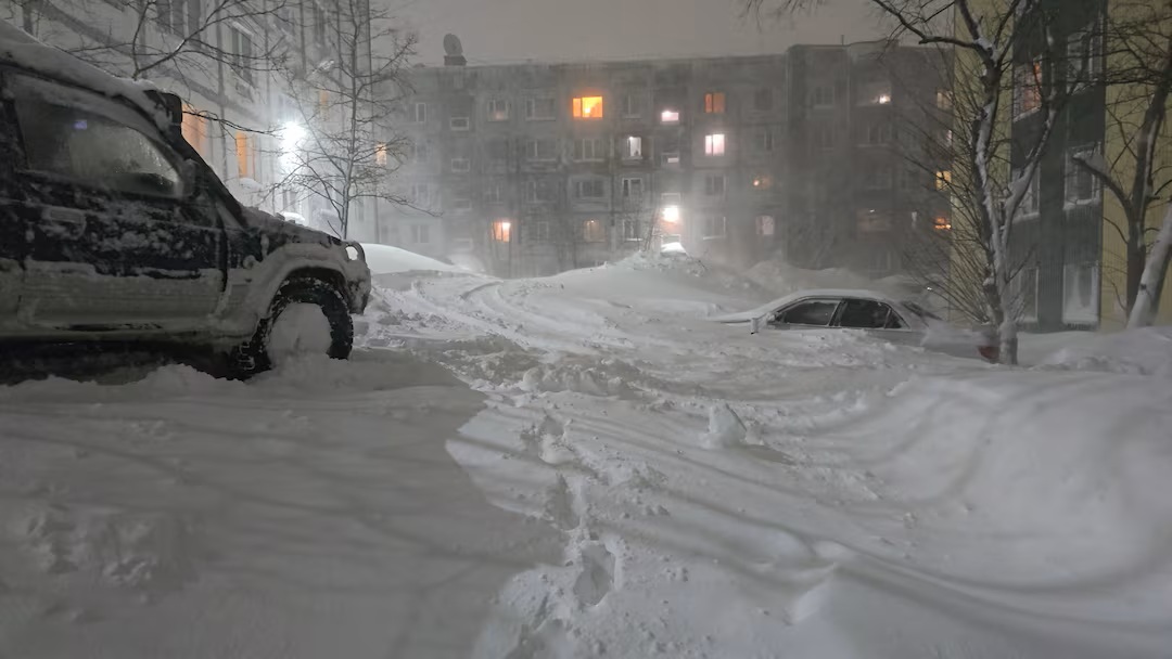 Ogromni snežni zameti, ki segajo skoraj do drugega nadstropja stanovanjskih blokov v Petropavlovsk-Kamčatskem. Ulice so popolnoma zasute, vidni so le vrhovi avtomobilov in svetilke.