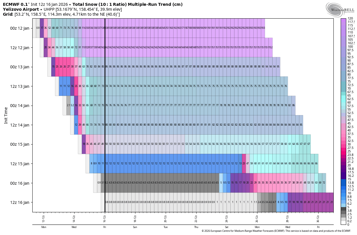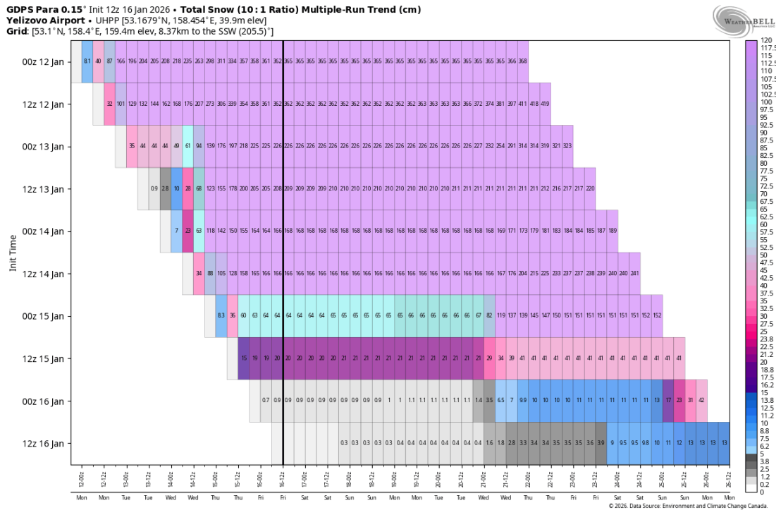 Napoved kanafskega modela za snežno kumulativo na letališču Yelizovo, ki je okoli 30km oddaljen od Petropavlovsk