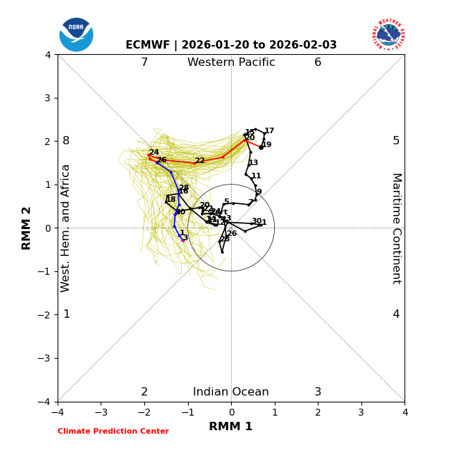 Vzrok za ta razvoj je v odboj stratosferskih valov, ki ravnokar poteka. Pomagal je poglobiti negativne faze AO in NAO ter okrepil arktični izliv proti Ameriki in atlantsko ciklogenezo. Faza 6 Madden-Julianove oscilacije (MJO), je podpirala blokirne vzorce na visokih širinah. Sedaj se je MJO premaknil v fazo 7, kar še dodatno podpira negativno NAO in podaljšanje grebena proti vzhodni Sibiriji. To bo ohranjalo nemirno vreme nad zahodno Evropo, z možnostmi za obilne padavine v Sredozemlju, če se curek malo umiri.