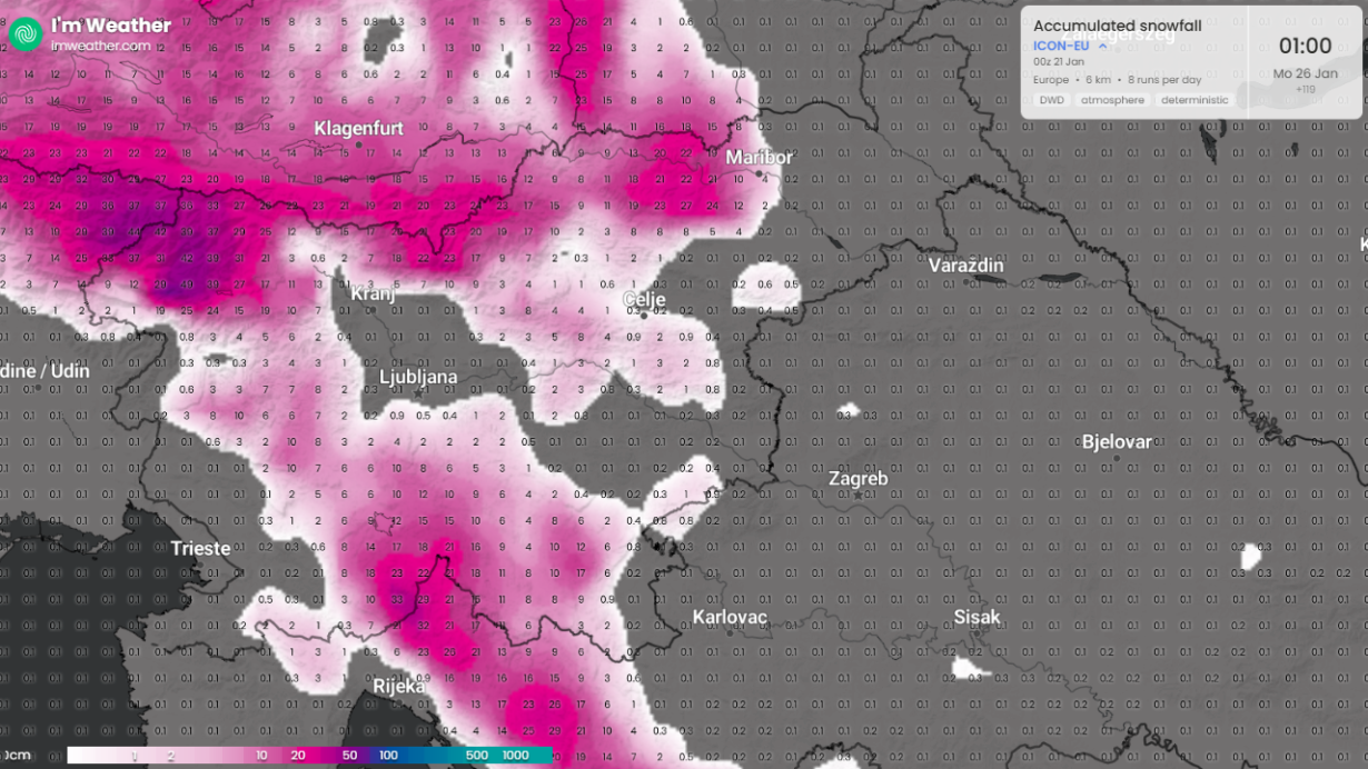 V zgornjesavski dolini bo večinoma snežilo tako v soboto kot nedeljo, v ljubljanski kotlini in povečini ostalih nižin pa bo v nedeljo verjetno prevladoval prehodni režim, v katerem se bosta izmenjavala dež in sneg oziroma mokri sneg, kar pomeni, da pri tleh najverjetneje ne bo merljive snežne odeje. Razen v nekoliko višjih legah, kar potrjuje spodnja karta.
