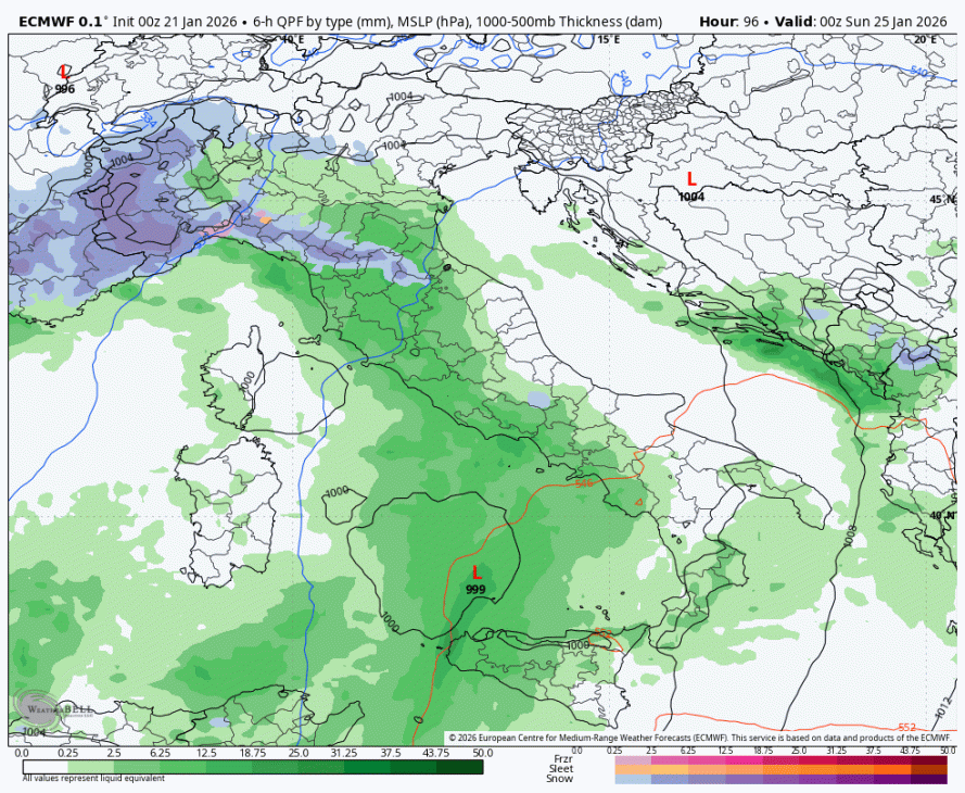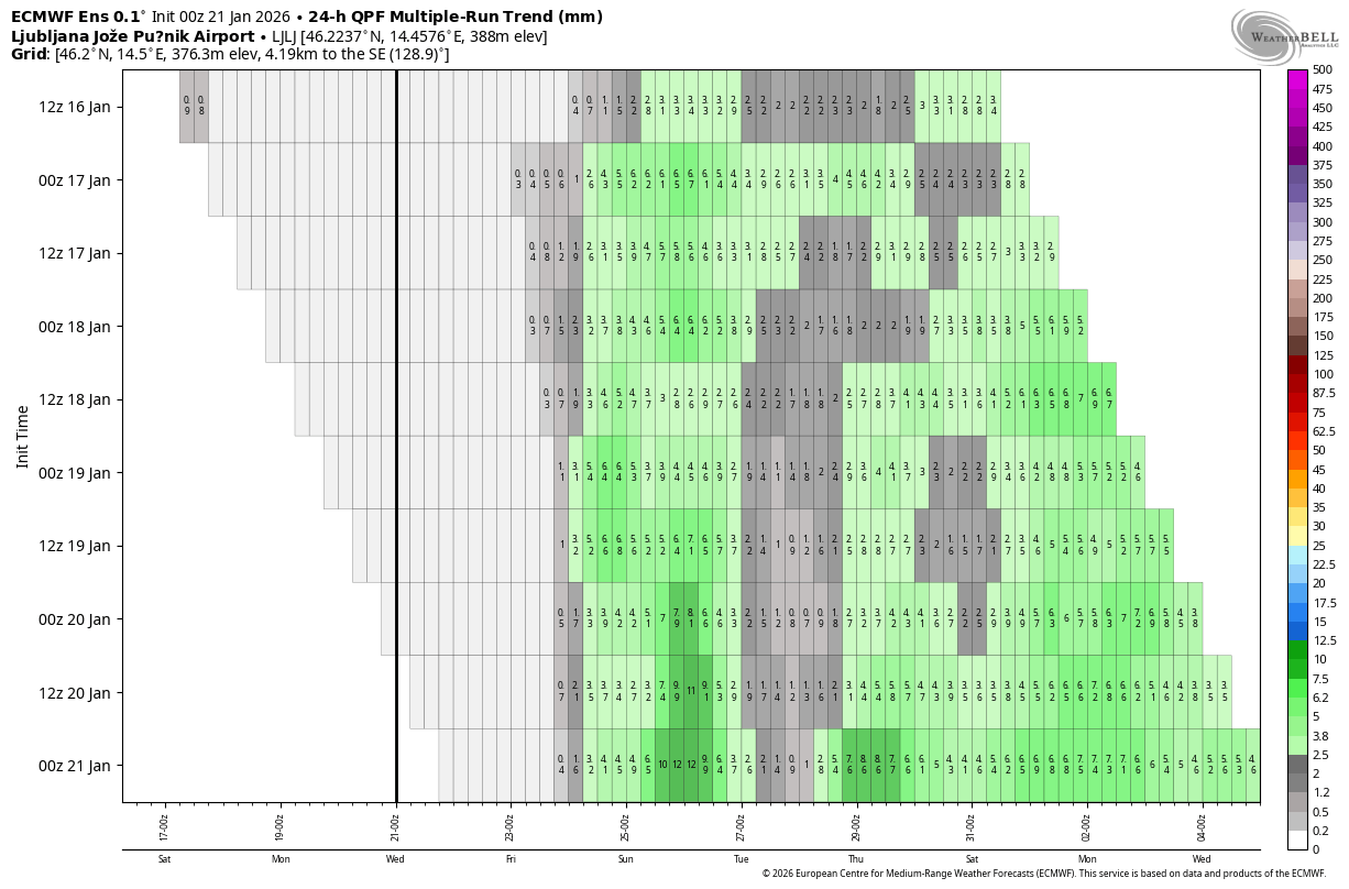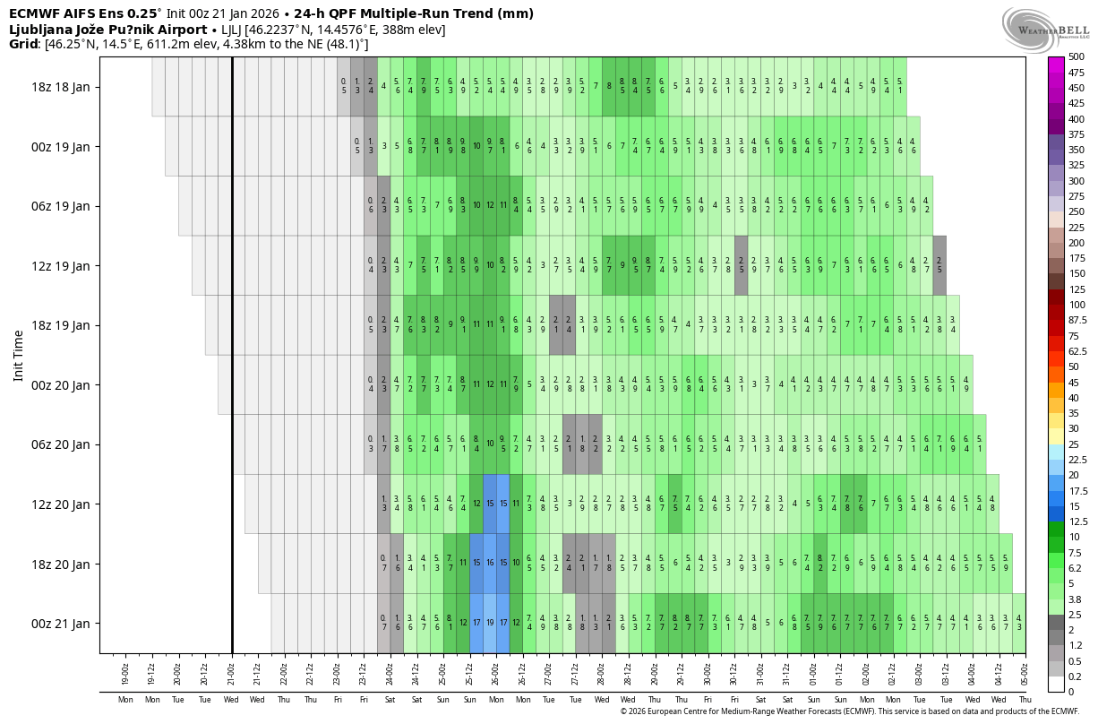 To pomeni, da bo Sredozemlje v prihajajočem obdobju pogosto izpostavljeno nizom atlantskih motenj, ki bodo nastajale ob izrazitih temperaturnih kontrastih nad severozahodnim Atlantikom. Ko se taka frontalna aktivnost premika čez Sredozemlje, bo končni produkt padavin pri tleh v veliki meri odvisen od vertikalnega temperaturnega profila atmosfere ob prihodu fronte. Če v bližini oziroma nad območjem prihoda front ne bo na voljo dovolj hladen zračni stolpec — kot so to v posameznih modelskih runih prikazali izračuni EC (npr. 12Z in prejšnji 00Z) — bodo padavine po nižinah prevladovale v obliki dežja. V nasprotnem primeru, kadar bo ob ali pred fronto prisotna hladnejša zračna masa ali bo prišlo do hitre advekcije hladnega zraka pri tleh, se bo meja sneženja lahko znižala in del padavin prešel v sneg tudi po nižinah.