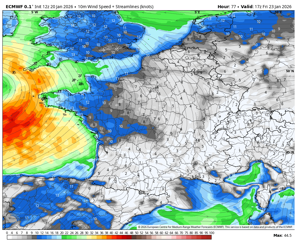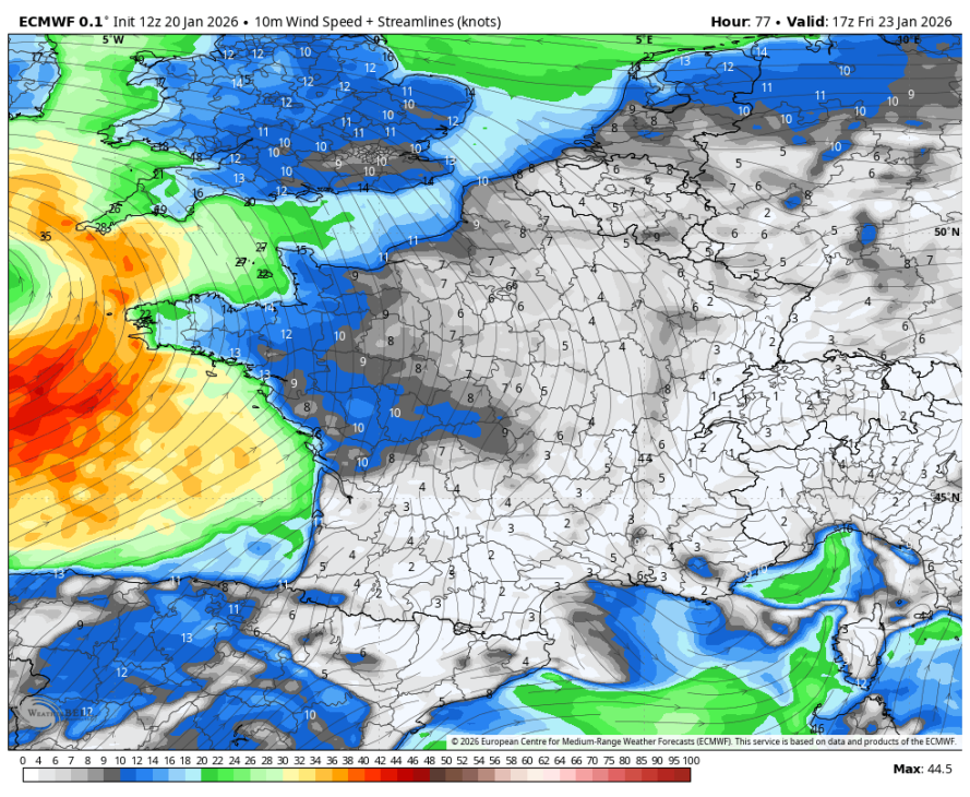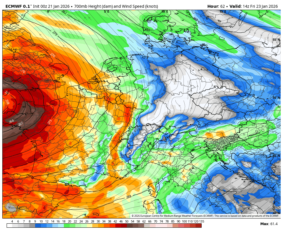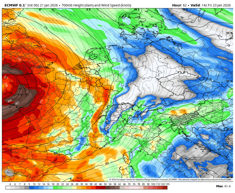 Globoki cikloni bodo prihajali iz Atlantika in prinašali močan veter ter obilne padavine, zlasti v delu zahodne, južne Evrope in Sredozemlja v naslednjih 7 do 10 dneh deležna nemirnega in precej dinamičnega vremena. Na zahodni obali, predvsem v Bretanji, danes sunki vetra presegajo 80 km/h, v petek pa lokalno celo okoli 100 km/h na izpostavljenih legah.