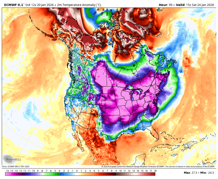 V Severni Ameriki to pomeni pravi arktični vdor. Velik del Kanade in severnih ter osrednjih Združenih držav bo v prihajajočih dneh in čez vikend doživel temperature, ki bodo 20 do 30 stopinj Celzija pod dolgoletnim povprečjem. Na severu ZDA, predvsem v Dakotah, lahko pričakujemo vrednosti pod minus 30 °C.
