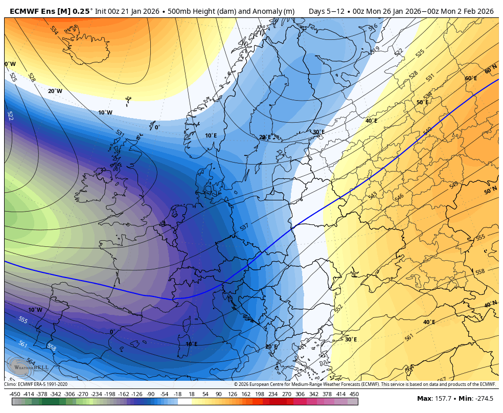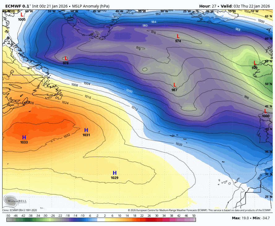 Trenutno se na severni polobli razvija zelo zanimiv in precej klasičen zimski vzorec, ki prinaša velike kontraste med regijami. Nad Arktiko in Grenlandijo se krepi območje visokega zračnega tlaka, kar blokira običajen tok hladnega zraka in ga usmerja veliko bolj južno. Posledica je močna negativna faza arktične oscilacije (AO) in severnoatlantske oscilacije (NAO), ki jo podpirata še negativna vzhodnopacifiška oscilacija (EPO) in pozitivna TNH faza.