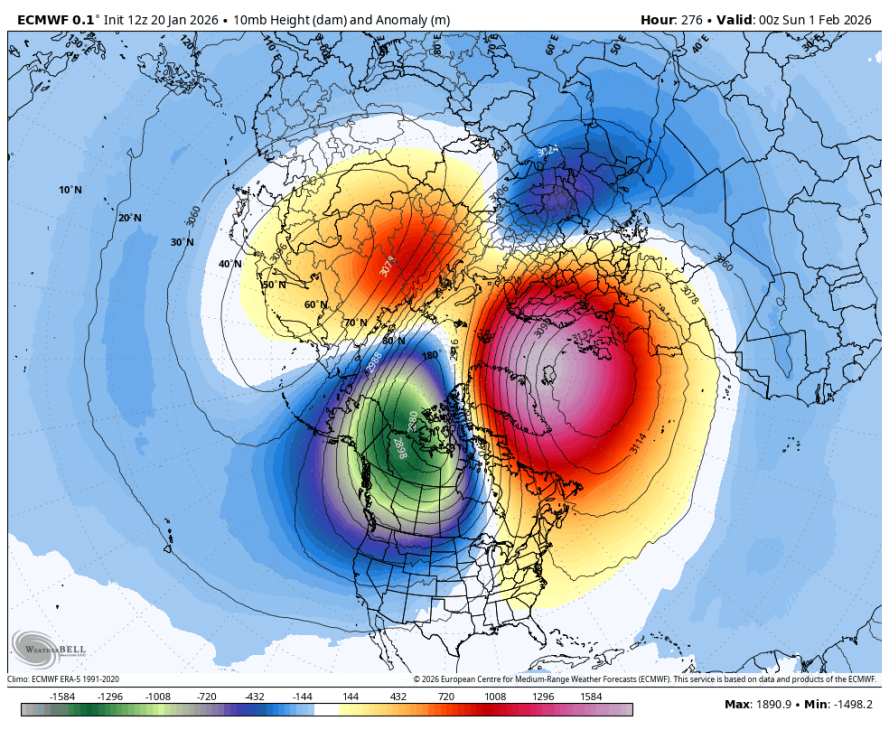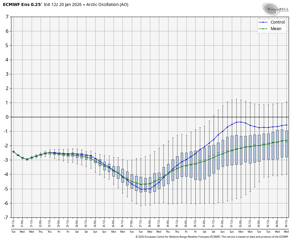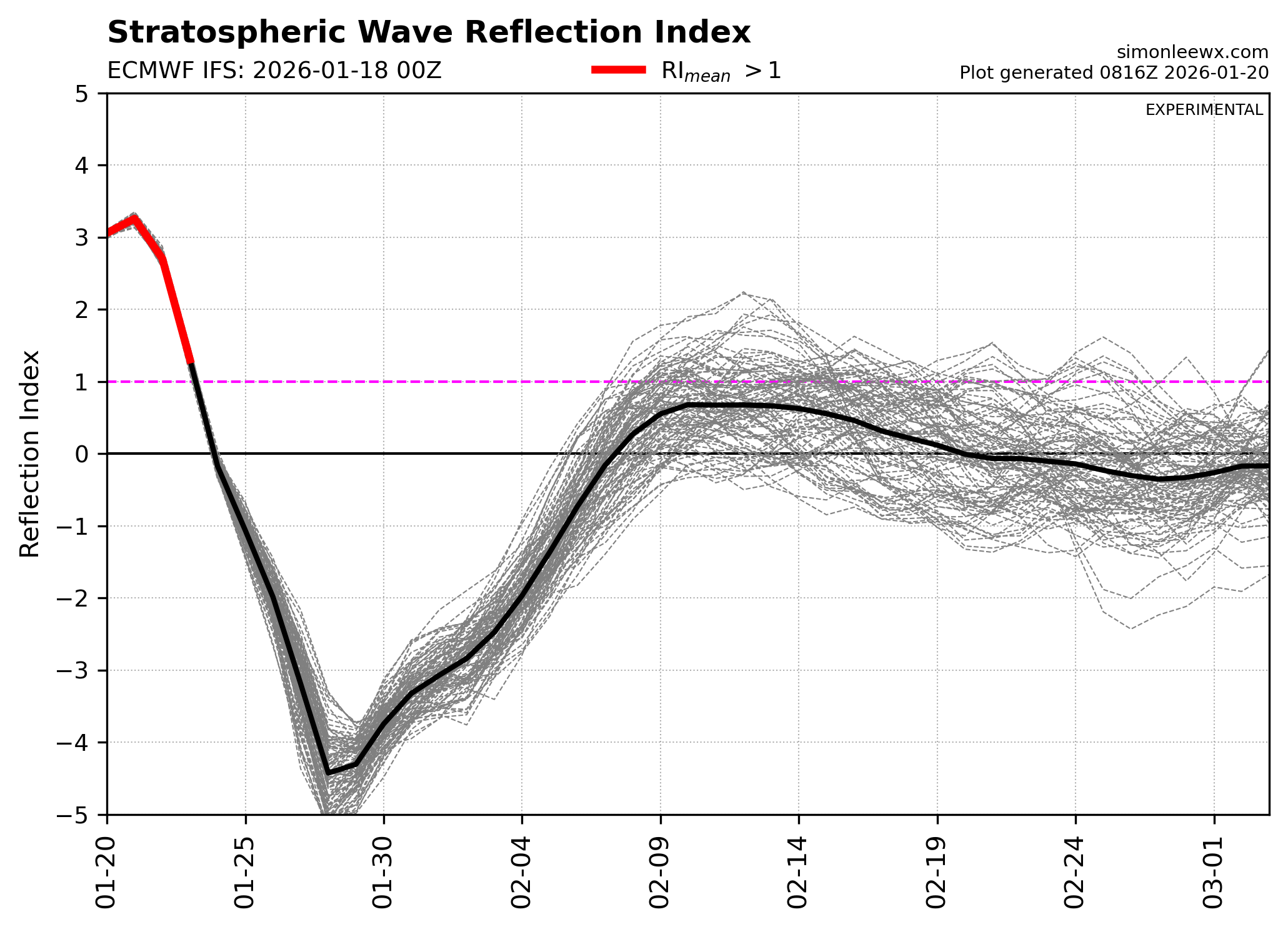 Potem indeks strmo pade v močno negativno območje (do okoli -5 proti koncu januarja) – valovi se ne odbijajo več, ampak gredo navzgor in se absorbirajo v stratosferi. To običajno oslabi polarni vrtinec zgoraj in konča tisti hitri vpliv na hladno vreme spodaj. Vendar razlika med pozitivnim in negativnim RI je na koncu lahko podobna, pri pozitivnem RI je odboj brez rušenja vrtinca, pri negativnem pa rušenje vrtinca z absorpcijo ampak oboje lahko konča v podobnem troposferskem rezultatu (negativna AO/NAO), le da z drugačnim časovnim potekom.