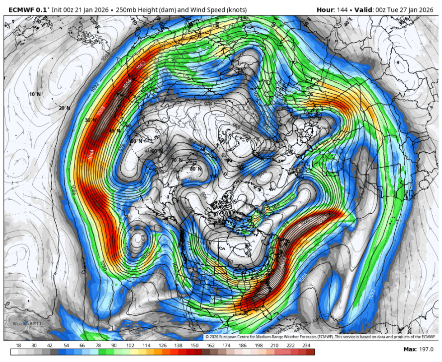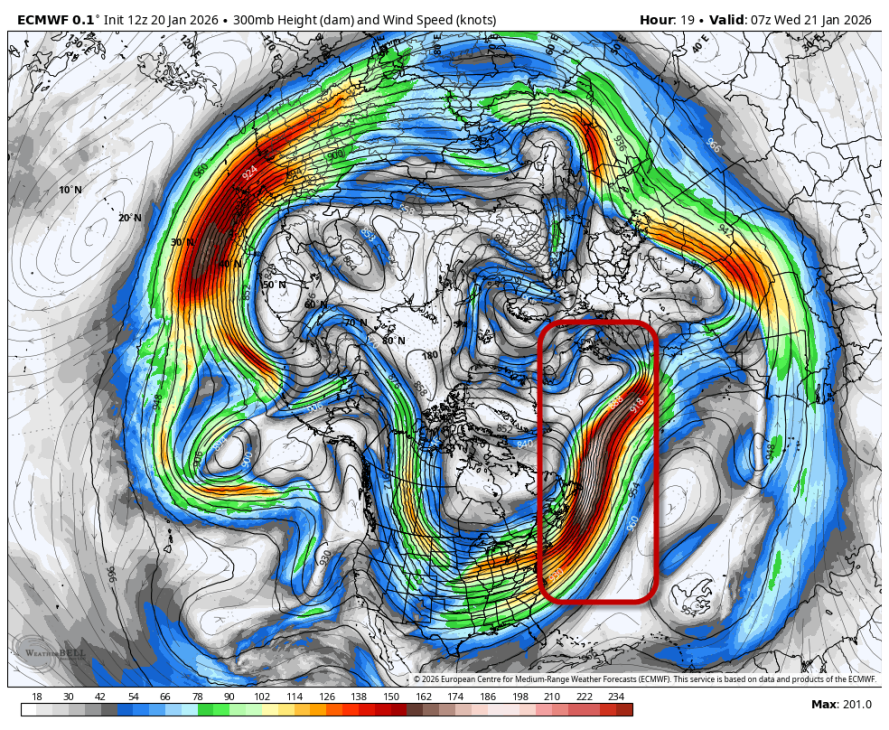 Nad Atlantikom se zaradi tega kontrasta krepi močan curek na relativno nizkih zemljepisnih širinah. Ta curek je “stisnjen” in okrepljen zaradi velikega temperaturnega kontrasta: na severu (nad Kanado/Atlantikom) teče hladna arktična zračna masa navzdol, na jugu pa toplejši subtropski zrak. To ustvari močan toplotni kontrast, ki “pospeši” veter na 300 hPa, kot kaže spodaj.