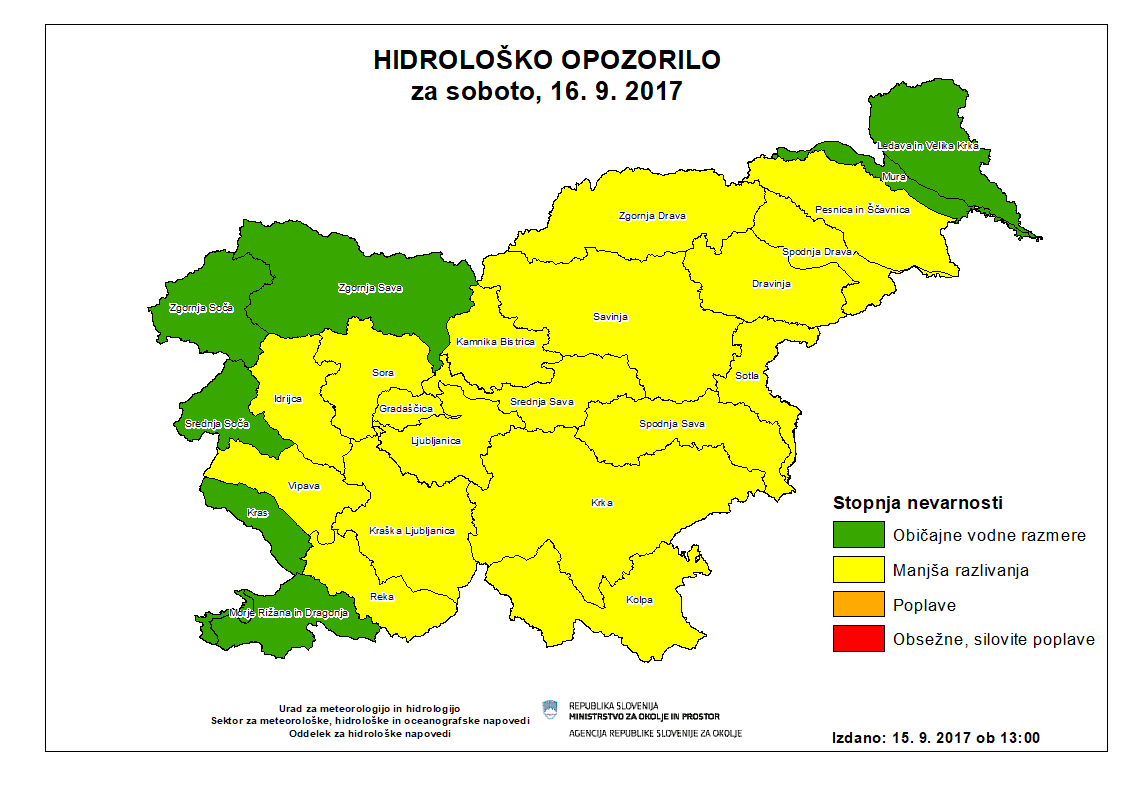 V noči na soboto in soboto dopoldan lahko manjše reke in hudourniški vodotoki na območju severovzhodne, osrednje, jugozahodne in zlasti jugovzhodne Slovenije hitro porastejo in pri tem poplavijo predvidoma na območjih pogostih poplav.