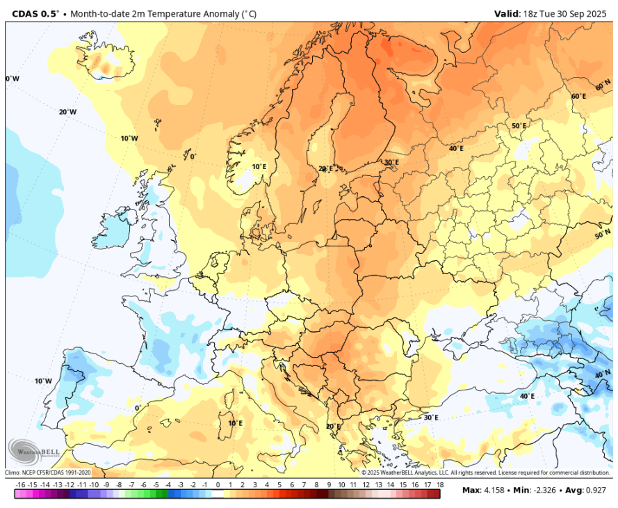 Temperaturne anomalije nad Evropo v septembru