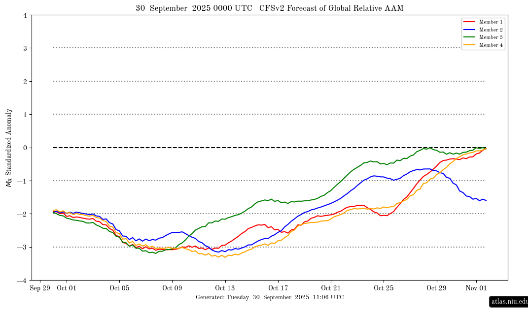 AAM je agregatni kazalnik porazdelitve vrtilnosti v atmosferi in reflektira, koliko “vrtilnega momenta” nosi atmosferski sistem. Hitri in močni premiki v tropski konvekciji lahko privedejo do znatnega prenosa vrtilnosti in posledično do padcev AAM. Ko AAM znatno pade, se zmanjša skupna podpora zonalnemu toku in se poveča verjetnost premika proti bolj meridionalnemu toku, z večjo pogostostjo blokad in globokih vdihov hladnega zraka. Časovni zamik med tropskim impulzom in odzivom AAM je pogosto večtedenski, zato je natančna usklajenost ključni dejavnik pri oceni, ali bodo ti signali delovali konstruktivno in povzročili izrazit prehod v drugačno cirkulacijsko stanje.
