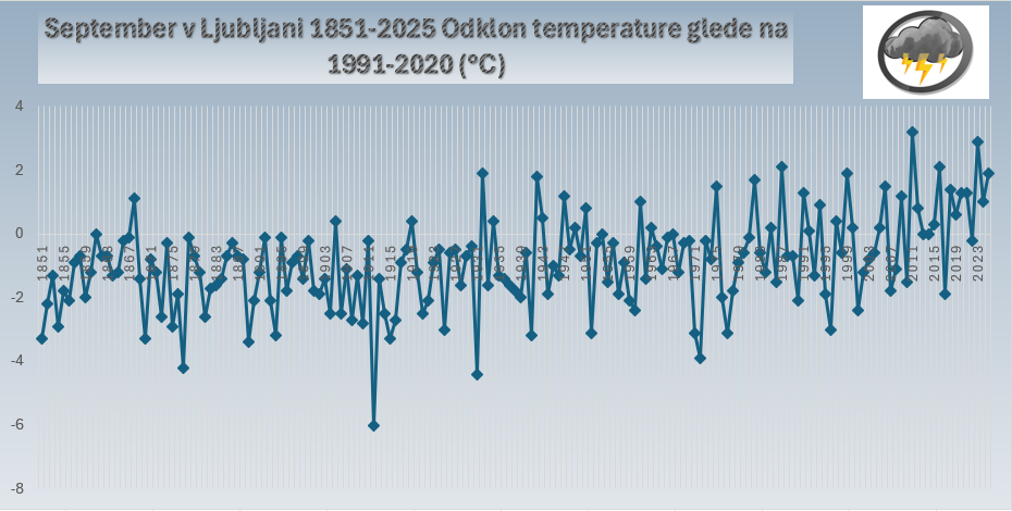 Temperaturni odklon v Ljubljani med septembri 1851-2025