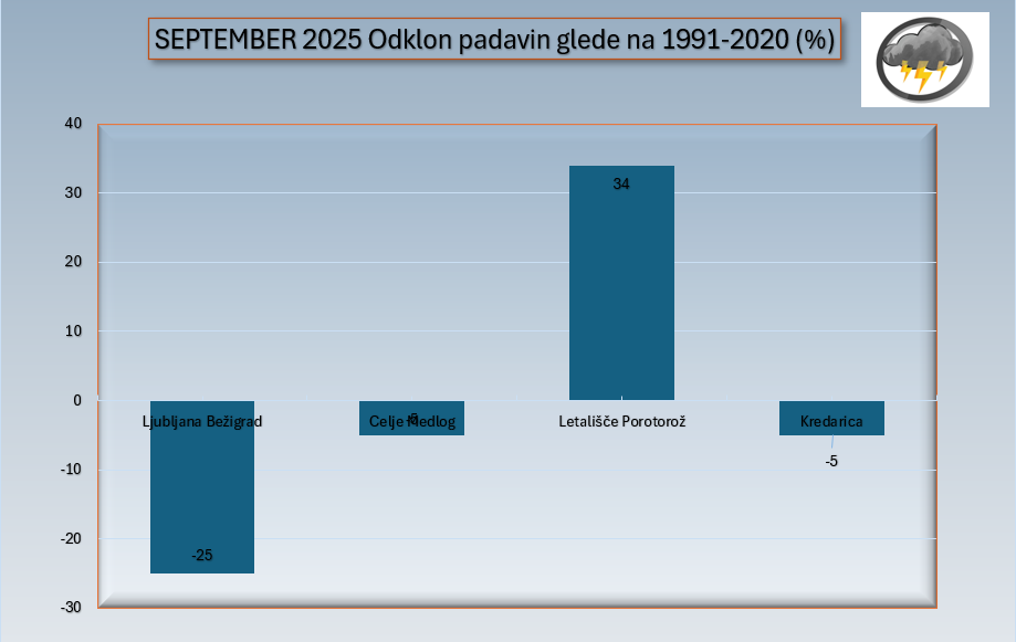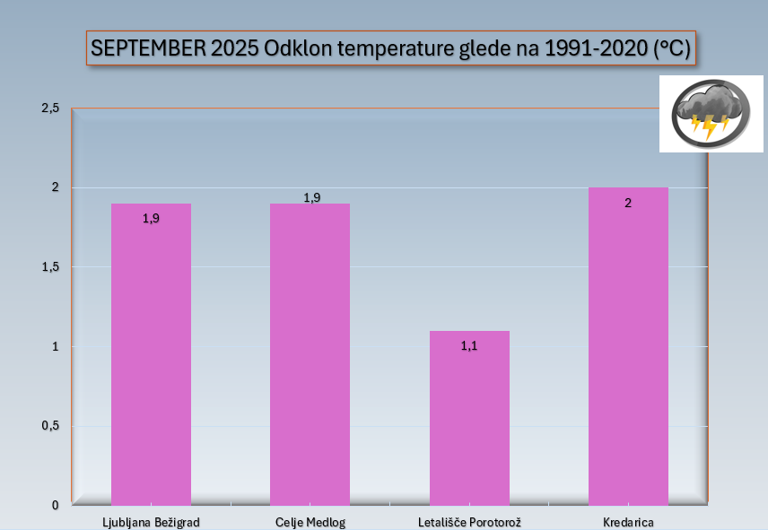 Končal se je prvi jesenski mesec september. V Ljubljani je bila povprečna temperatura +18,1 °C, kar je +1,9 °C več od dolgoletnega povprečja 1991-2020. V Ljubljani je bil peti najtoplejši od začetka meritev skupaj s septembrom leta 1932 in 1999. Na Kredarici in v Celju je bil odklon podoben in je znašal +2,0 °C in +1,9 °C. Manjši odklon je bil na letališču Portorož in je znašal +1,1 °C.