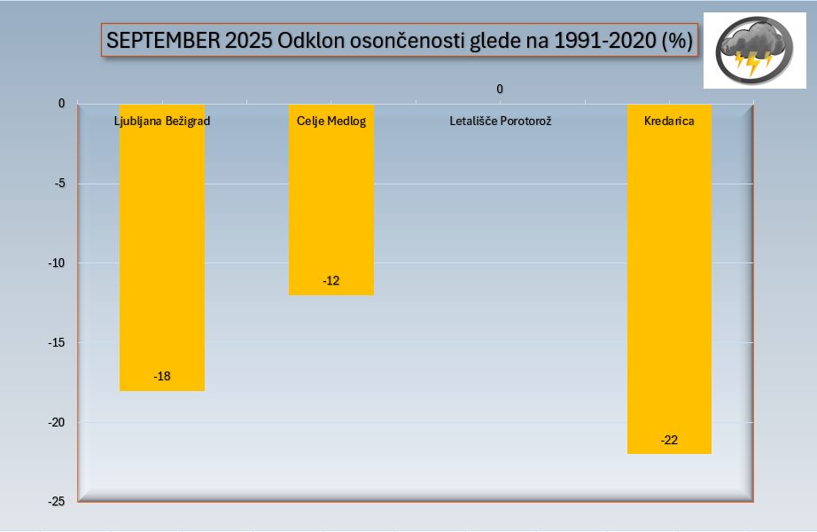 Najmanj sonca glede na povprečje je bilo na Kredarici, sonce je sijalo le 78% povprečja, v Ljubljani 82% in v Celju 88% dolgoletnega povprečja