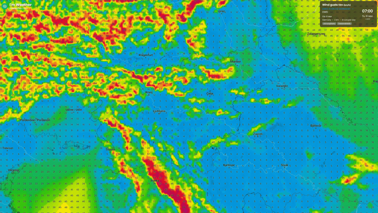 Na Gorenjskem lahko sunki vetra presegajo 80 do 100 km/h, lokalno tudi več, predvsem v višjih in izpostavljenih legah. Močan veter bo prisoten tudi drugod po severni in zahodni Sloveniji, nekoliko šibkejši pa v osrednjih in vzhodnih krajih.