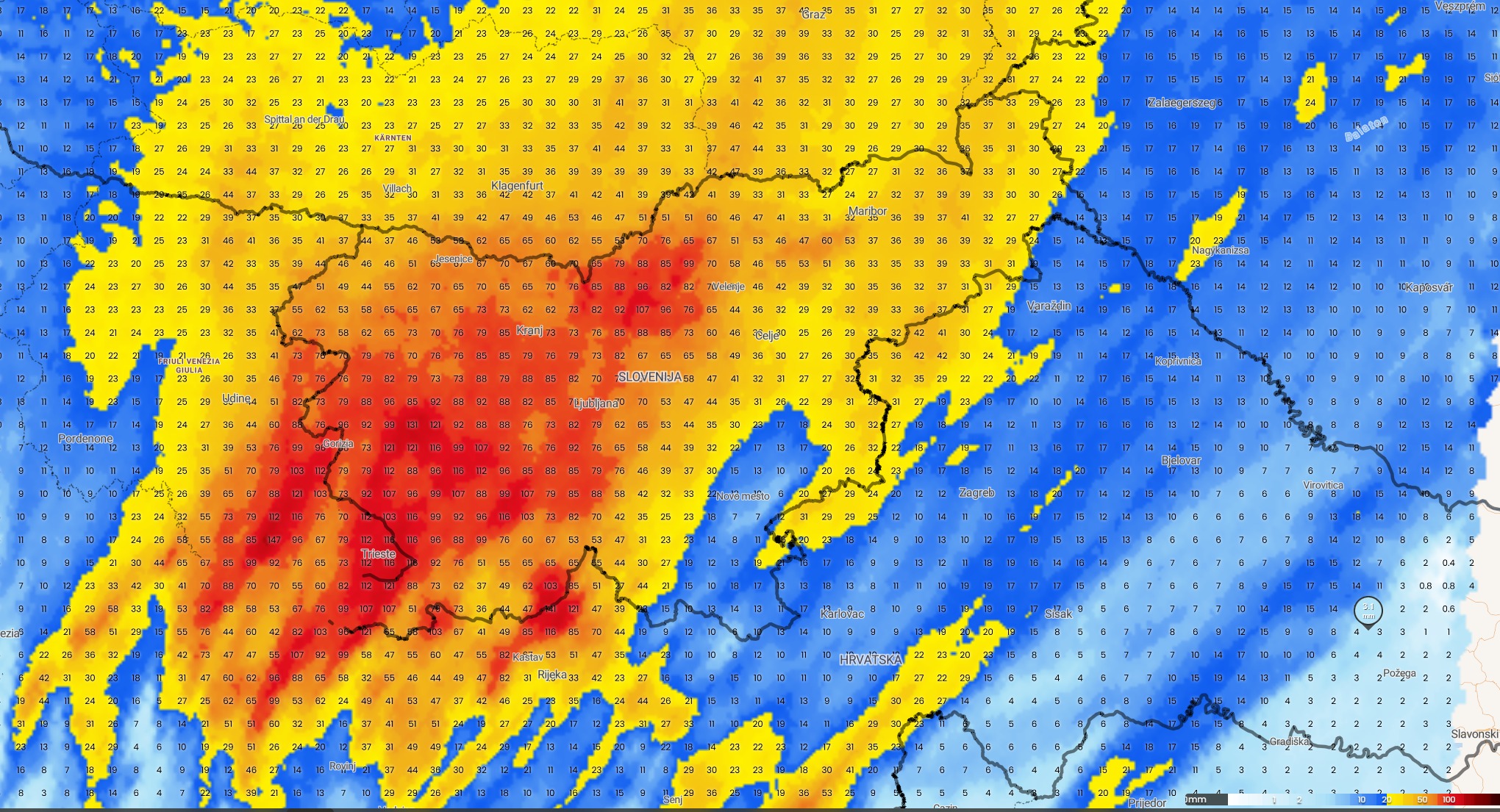 Noč je minila razmeroma mirno, zdaj pa se bodo, kot je bilo napovedano včeraj, začeli intenzivni nalivi na Primorskem. Nevihtni pasovi z nalivi se bodo širili v notranjost države in proti vzhodu. Nevarnost za zahodni del države še vedno ostaja – predvsem v obliki hudourniških poplav, zastajanja padavinske vode ter kasnejših poplav posameznih rek. V vremenskih modelih se je sicer nekoliko zmanjšala količina padavin, kar je več kot dobrodošlo, zato smo posledično tudi znižali stopnjo nevarnosti. Kljub temu bodo lokalno še vedno prisotne težave, zato priporočamo, da spremljate opozorila pristojnih služb.