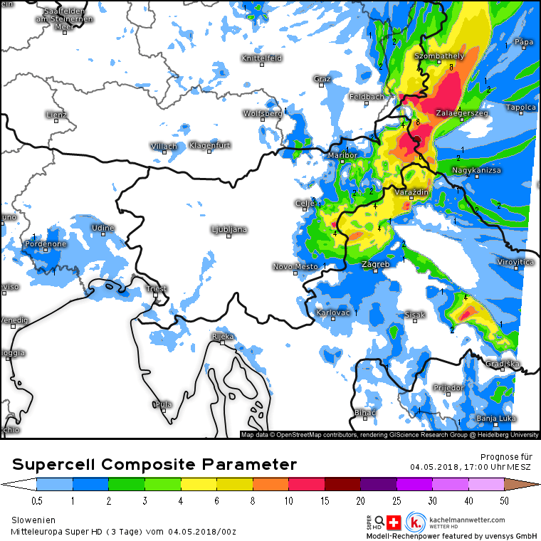 Možnost nastanka superceličnih neviht bo največja v severovzhodni Sloveniji, predvsem v Prekmurju. Supercelične nevihte bodo možne tudi na Hrvaški in Madžarski strani. Vir karte: kachelmannwetter.com