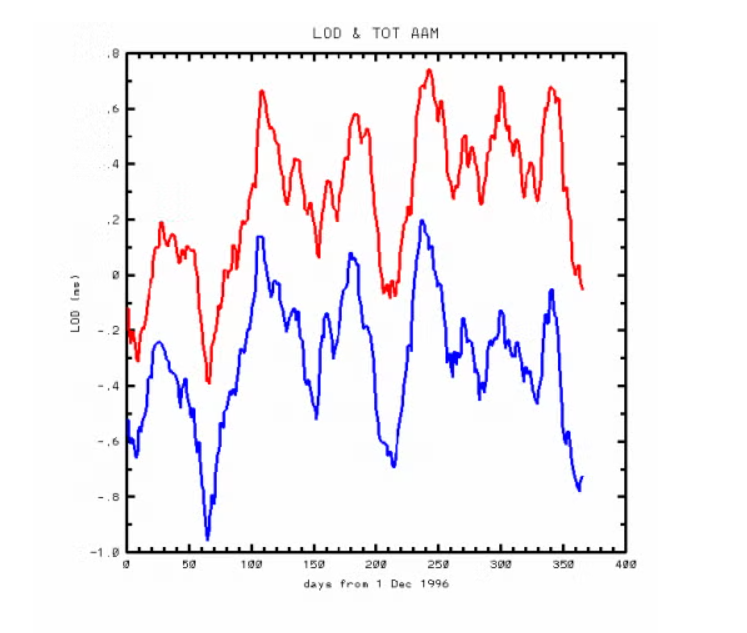 Anomalije v dolžini dneva (modro) in skupnem globalnem atmosferskem vrtilnem momentu (rdeče) za obdobje od 1. decembra 1996 do 30. novembra 1997. Na rdeči krivulji je bila uporabljena pretvorba iz enot AAM v enote LOD (Rosen, 1993).