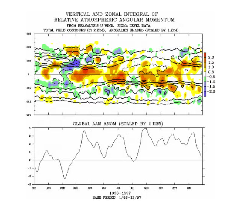 Zonalni (zgornji) in globalni (spodnji) integral atmosferskih anomalij vrtilnega momenta za december 1996 do november 1997. Na dnevne podatke v obeh panelih je bilo uporabljeno petdnevno tekoče povprečje. Za več podrobnosti o zgornji plošči glejte naslov slike in barvno vrstico.
