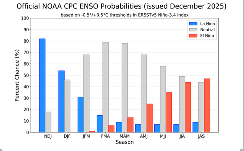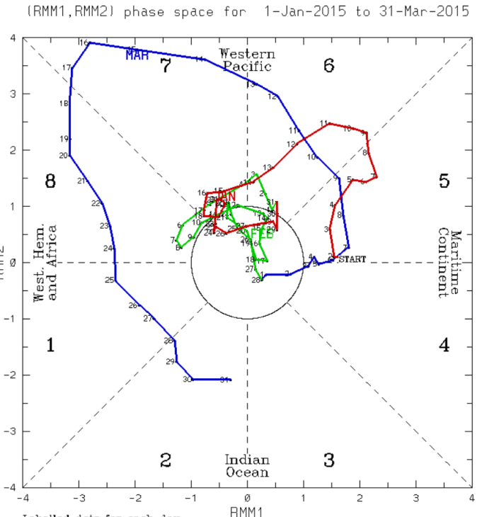 Po napovedih vodilnih meteoroloških centrov, kot sta NOAA in avstralski BOM, se šibka La Niña, ki vpliva na vreme letošnje zime, spomladi 2026 postopoma umika in preide v nevtralno stanje ENSO. Modeli kažejo naraščajočo verjetnost – okoli 40 do 45 odstotkov – da se do poletja ali jeseni 2026 razvije El Niño. Zgodovinski primeri, kot sta močna El Niña 1997–98 in 2015–16, kažejo, da takšne prehode pogosto spremljajo močni pulzi Madden-Julian oscilacije z visoko amplitudo, zlasti aprila in maja. Ti pulzi lahko sprožijo močne zahodne vetrovne sunke v tropih, ki pospešijo kopičenje tople vode v vzhodnem Pacifiku in hkrati povzročijo opazen dvig globalnega atmosferskega kotnega momenta. Če se ta scenarij uresniči, bi lahko že spomladi 2026 opazili intenzivnejšo aktivnost MJO, kar bi vplivalo na globalne vremenske vzorce tudi pri nas.